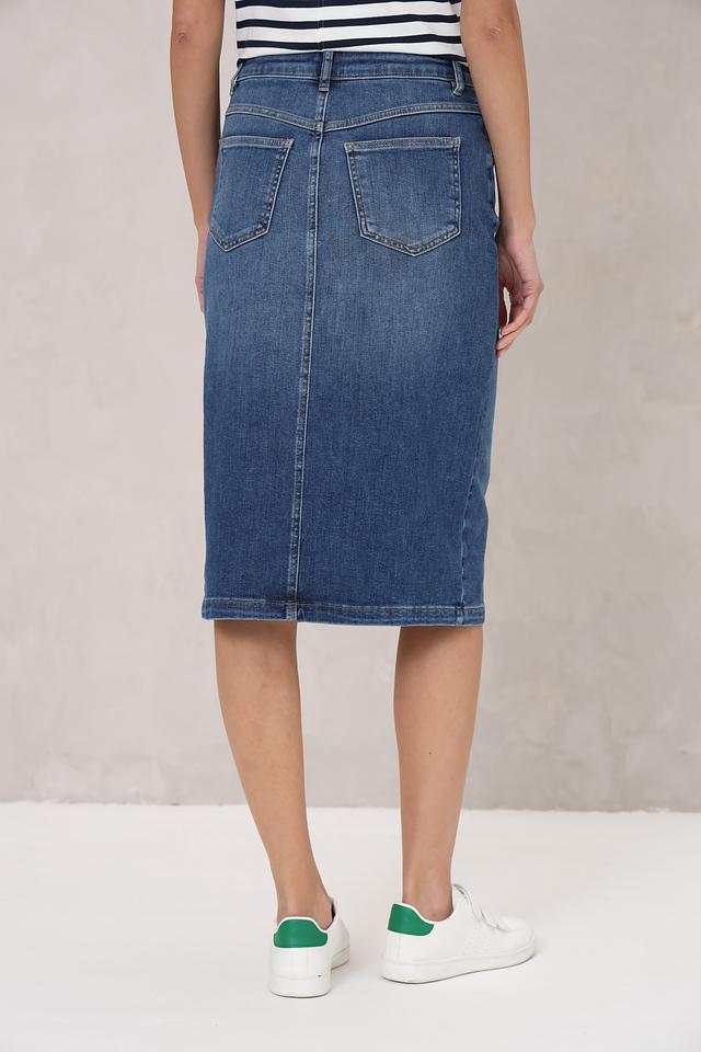 Юбка имеет классический миди-фасон и прямой крой. Застежка на молнию и пуговицу в поясе. Модель дополнена функциональными карманами спереди и сзади. Наличие небольшого разреза сзади обеспечивает свободу движений.