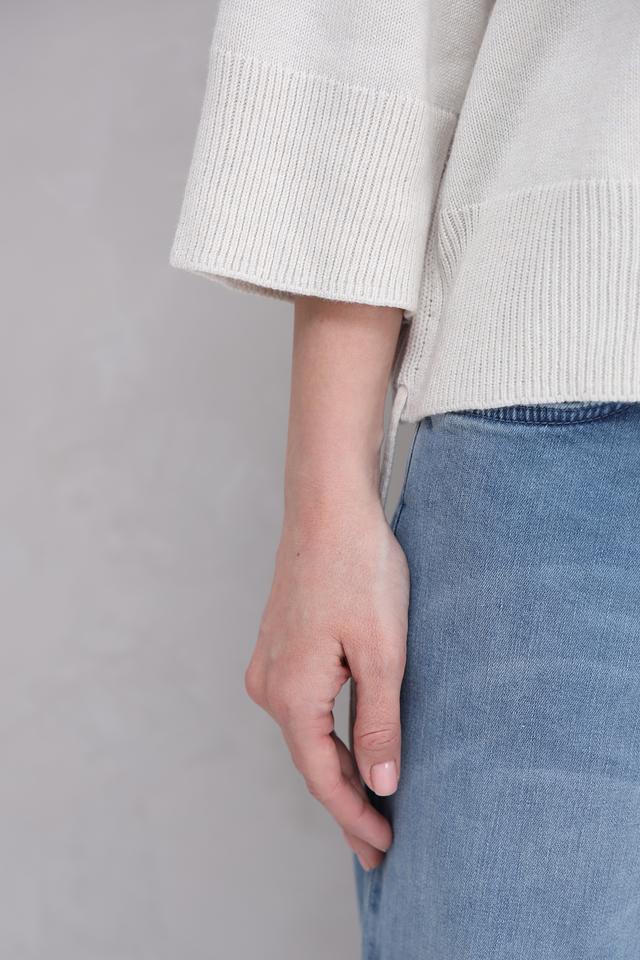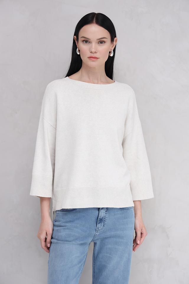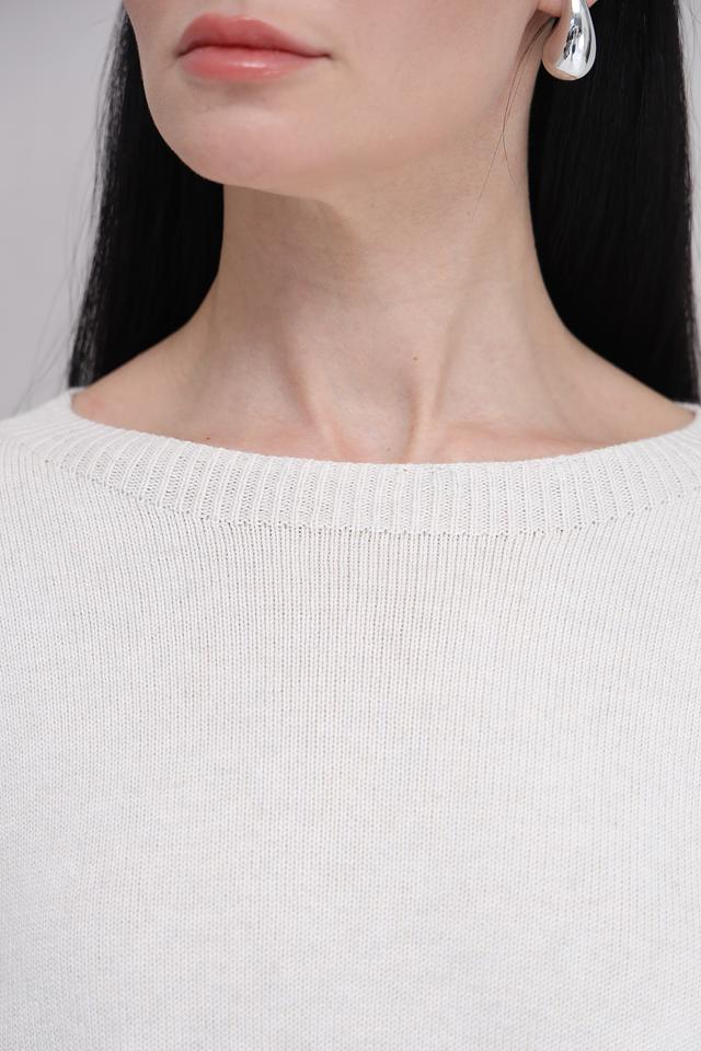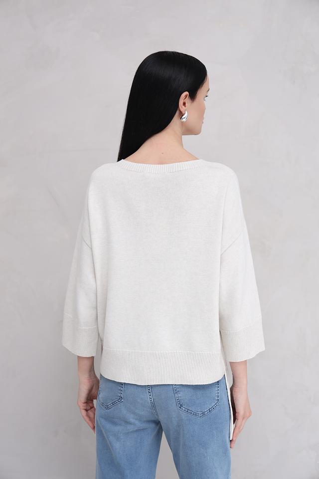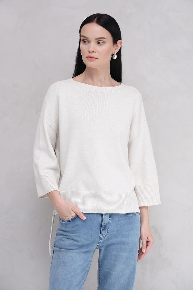 Пуловер имеет округлый вырез горловины и рукава три четверти, что делает его универсальным для различных образов. Текстура трикотажа приятна на ощупь и хорошо держит форму.