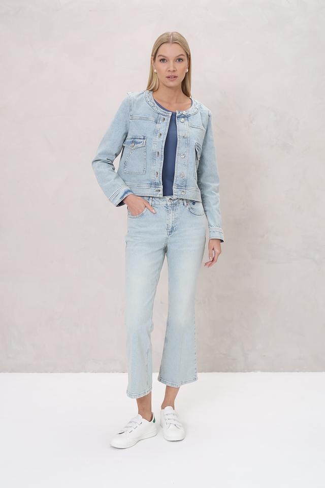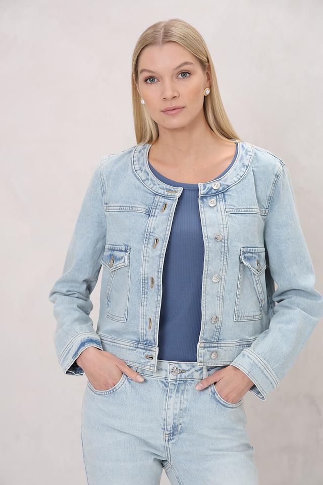 Жакет Oui голубого цвета выполнен из денима с застежкой на пуговицы. Модель имеет короткий крой и накладные карманы, что придает ей стильный и современный вид. Идеально дополнит повседневный образ. Состав: хлопок 97%, полиэстер 2%, эластан 1%