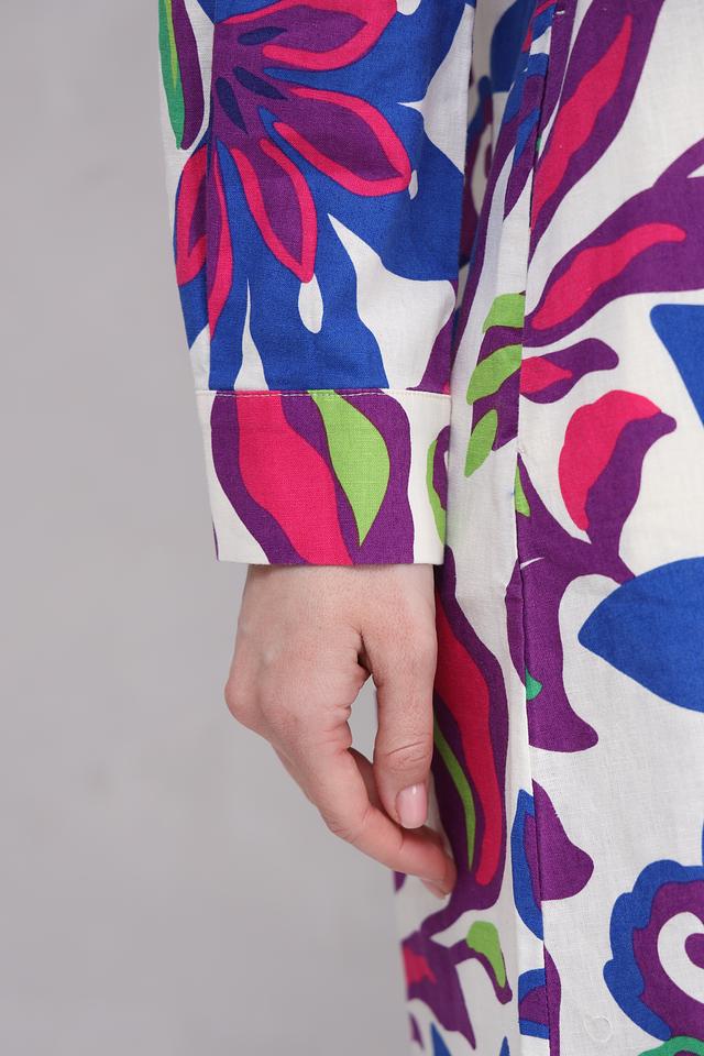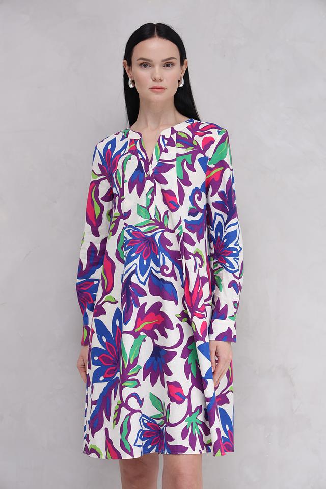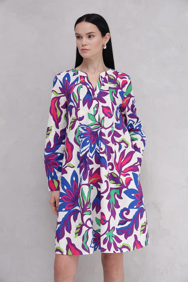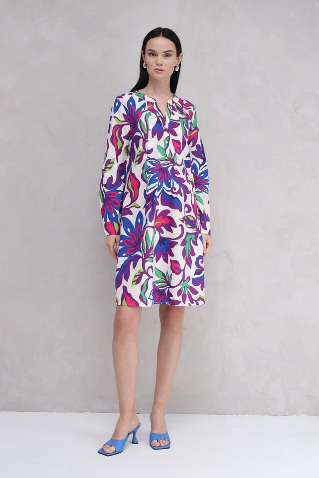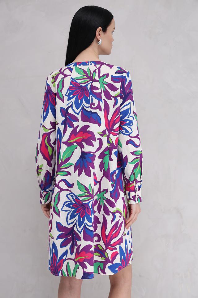 Платье имеет прямой силуэт, длинные рукава и V-образный вырез. Его украшает яркий и красочный цветочный принт, который делает его особенно привлекательным и женственным. Застёжка в виде пуговиц добавляет изысканности.