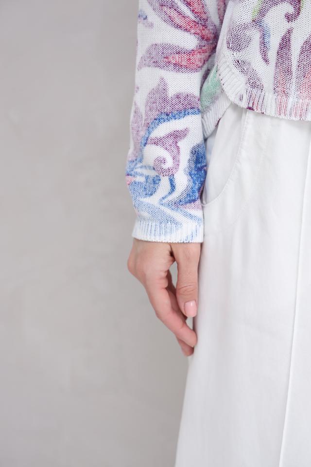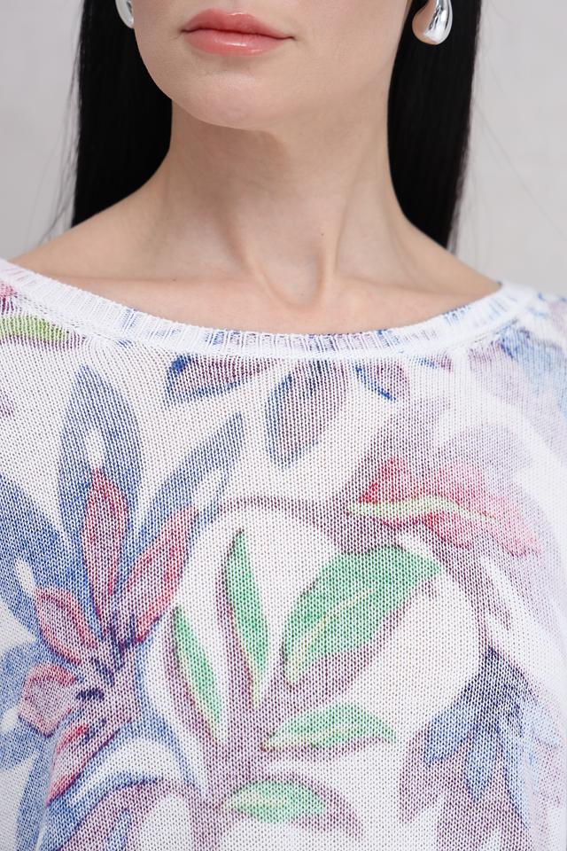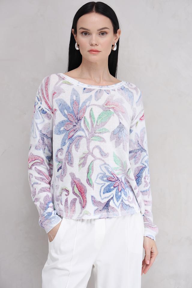Дизайн пуловера отличается округлым вырезом горловины и длинными рукавами. Принт выполнен в технике акварели, с использованием различных оттенков синего, розового, зеленого и фиолетового, создавая эффект легкости и воздушности.