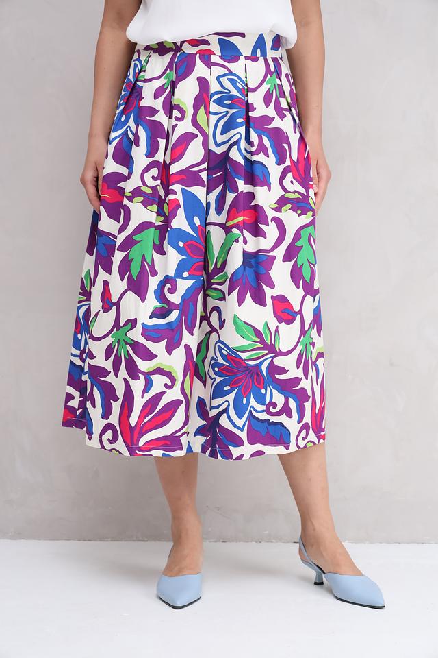 Юбка от бренда Oui выполнена в белом цвете с ярким цветочным принтом. Модель имеет расклешенный силуэт и длину миди, идеально подходит для создания стильных образов. Состав: хлопок 100%