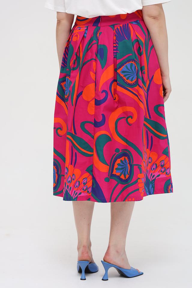 Юбка имеет расклешенный силуэт и длину миди, что делает ее универсальной для различных случаев. Главная особенность этой модели – эффектный цветочный принт, выполненный в ярких и насыщенных оттенках.