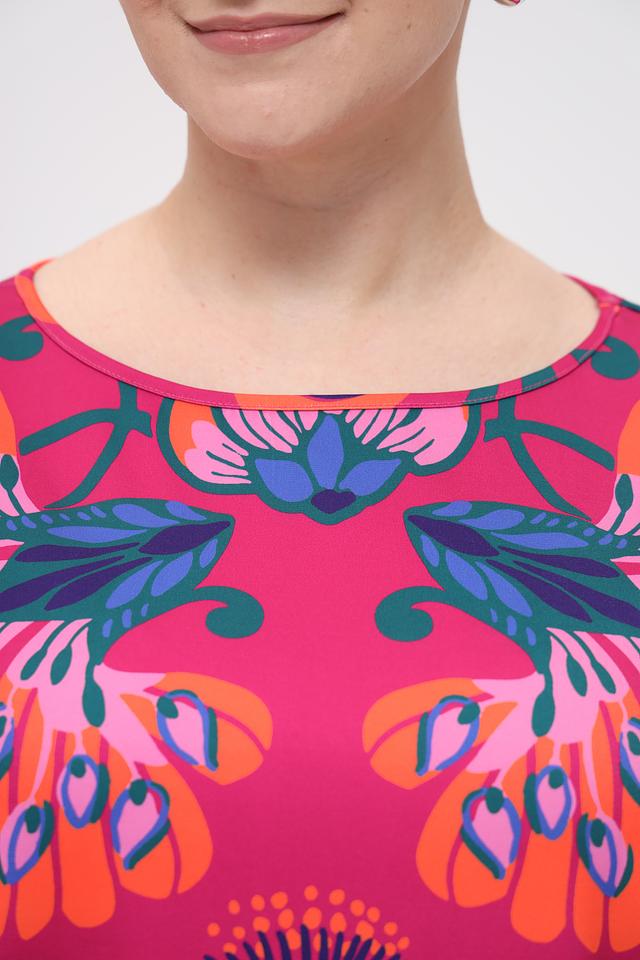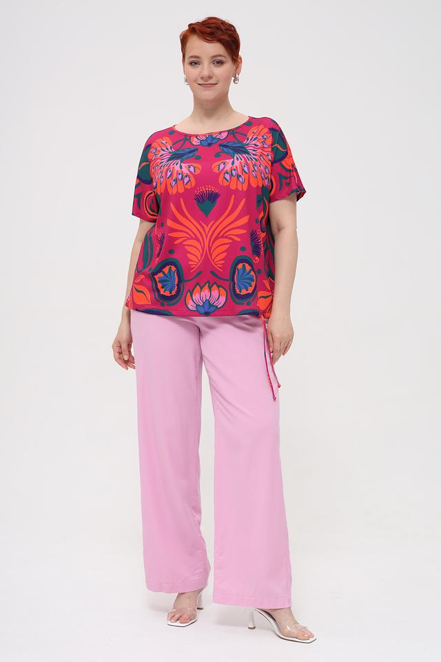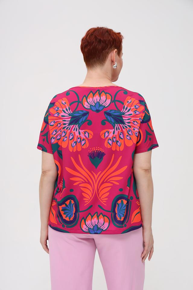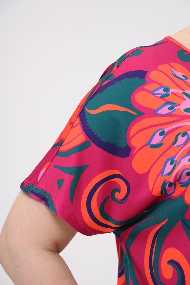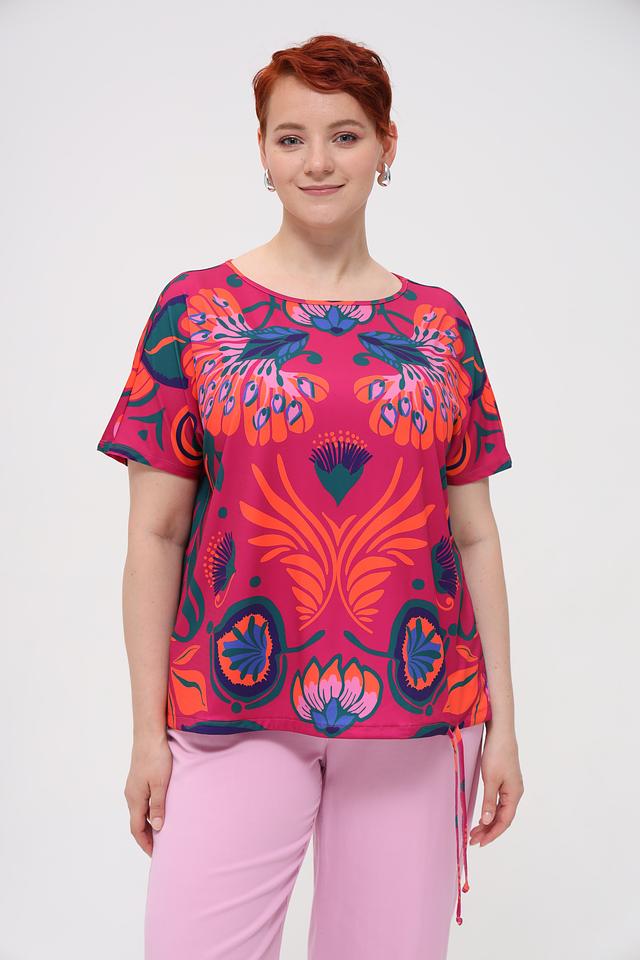 Блуза имеет свободный крой, короткие рукава и округлый вырез горловины. Главная особенность модели – крупный, красочный цветочный принт, выполненный в насыщенных оттенках оранжевого, синего и зелёного на малиновом фоне.