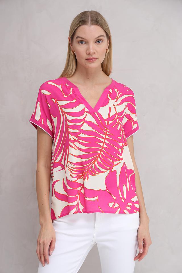 Фуксиевая блуза Oui с ярким цветочным принтом и V-образным вырезом. Изготовлена из мягкой вискозы, обеспечивающей комфорт и лёгкость в носке. Идеальный выбор для создания стильного и женственного образа. Состав: вискоза 100%