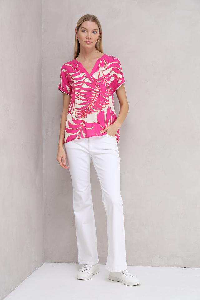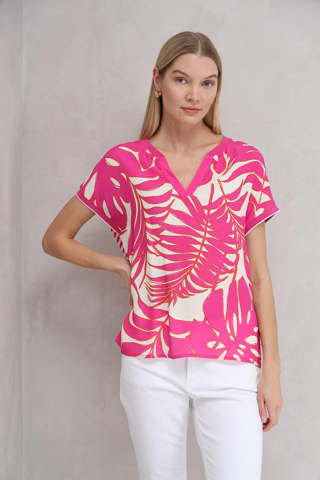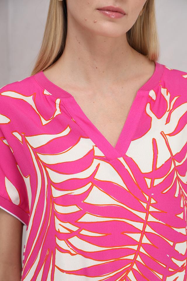Модель имеет свободный крой, короткие рукава и V-образный вырез, что придаёт ей лёгкость и непринуждённость. Основной цвет блузы – фуксия, а яркий принт с крупными цветами добавляет образу оригинальности и женственности.