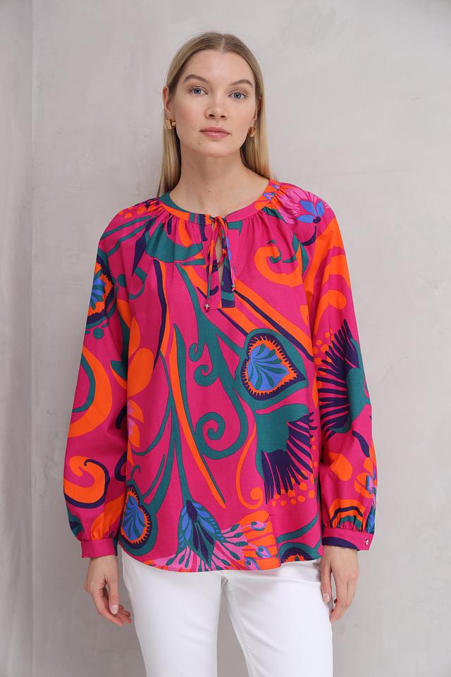 Блуза Oui фуксия с ярким цветочным принтом – стильное и комфортное решение для создания женственного образа. Модель выполнена из 100% хлопка, имеет округлый вырез и рукава-фонарики. Состав: хлопок 100%