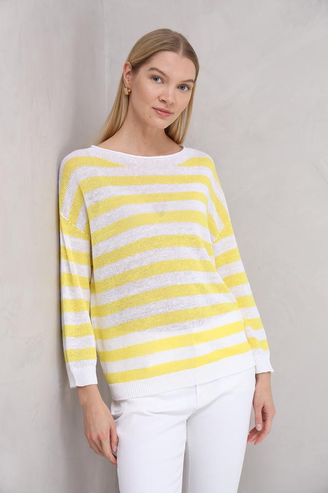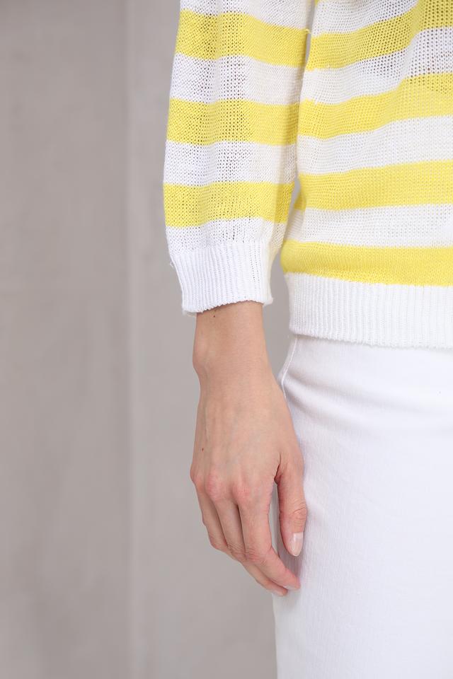 Пуловер украшен горизонтальной полоской в жёлтых и белых тонах, что придаёт ему свежий и летний вид. Текстура полотна лёгкая и воздушная, что делает этот пуловер идеальным выбором для тёплой погоды.