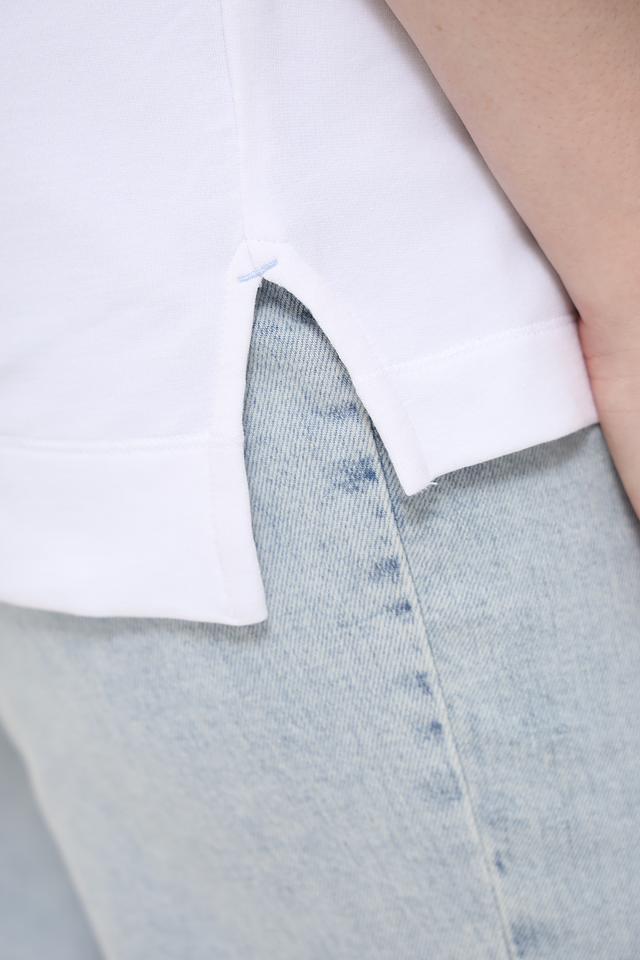Футболка изготовлена из высококачественного модала (70%), хлопка (25%) и эластана (5%). Модал придает ткани мягкость и шелковистость, хлопок обеспечивает воздухопроницаемость, а эластан – эластичность и сохранение формы.