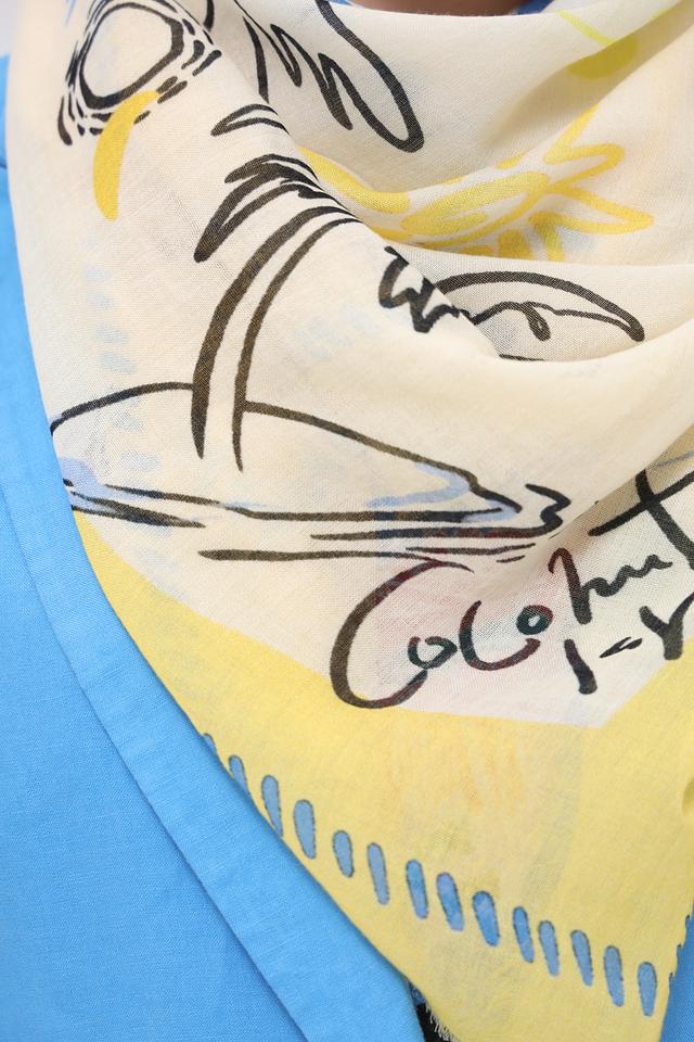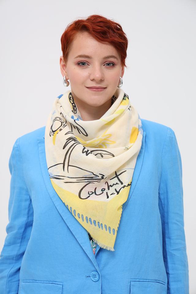 Этот стильный платок от бренда Oui станет ярким акцентом в вашем гардеробе. Он выполнен в нежном жёлтом цвете и украшен оригинальным принтом с изображением пальм, надписей и других летних мотивов.