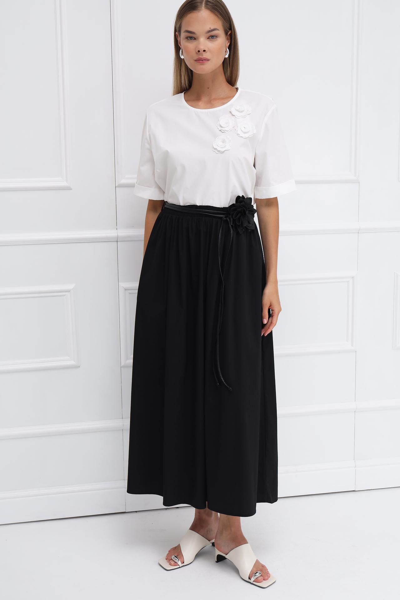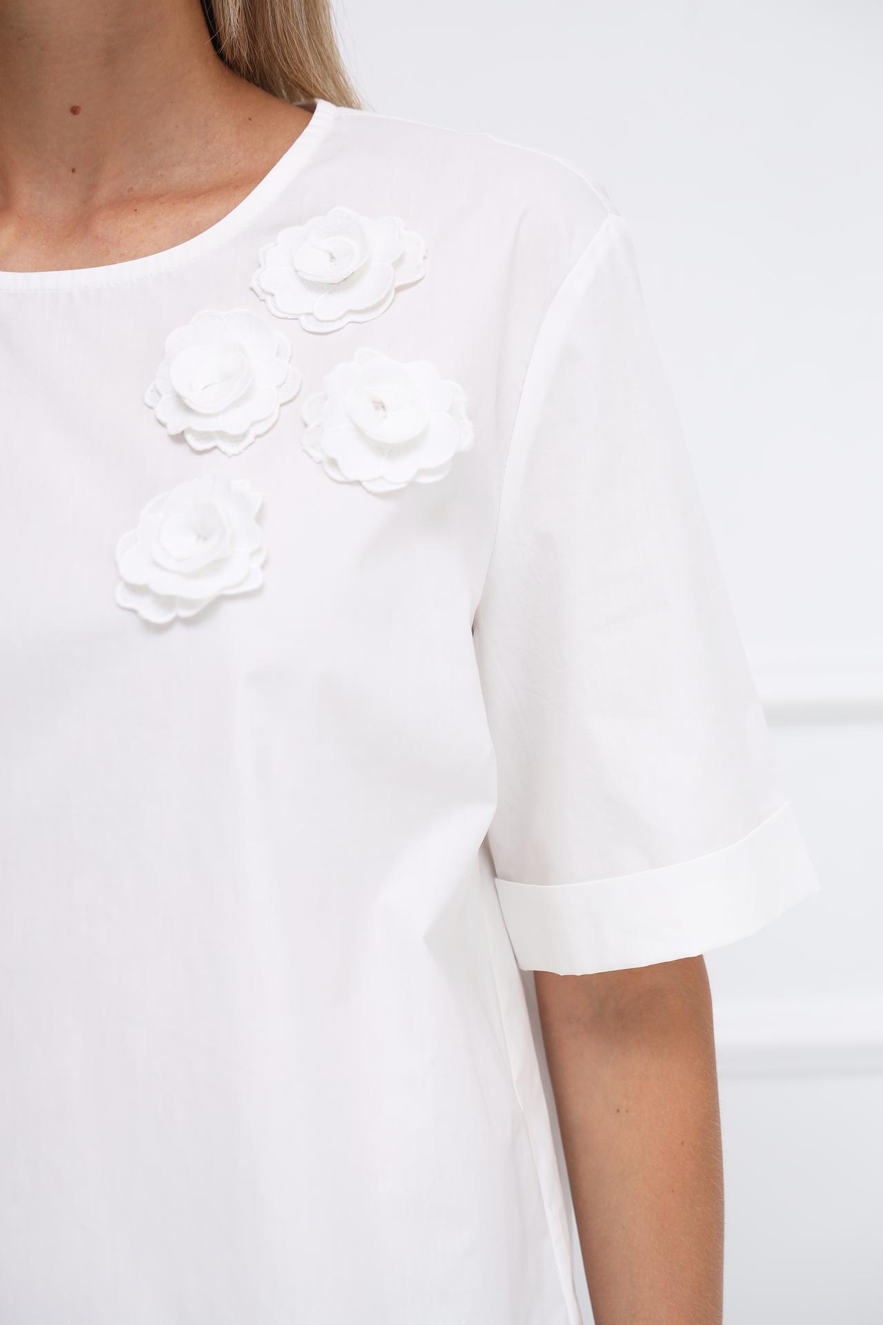 - Дизайн. Классический крой с округлым вырезом горловины и короткими рукавами, декорирован изящными элементами в виде цветов.