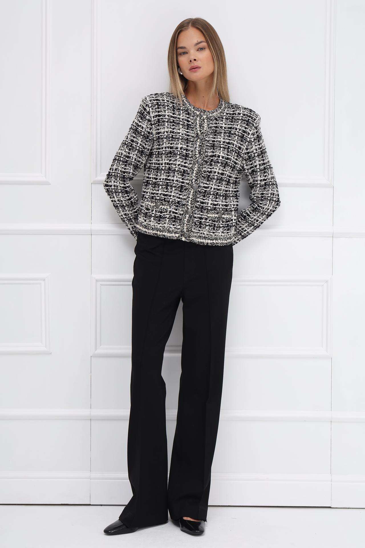 - Изысканный дизайн: Элегантный твидовый жакет с круглым вырезом и декоративными серебристыми пуговицами создаёт вневременной и утонченный образ. Идеально подходит как для офиса, так и для вечерних мероприятий.