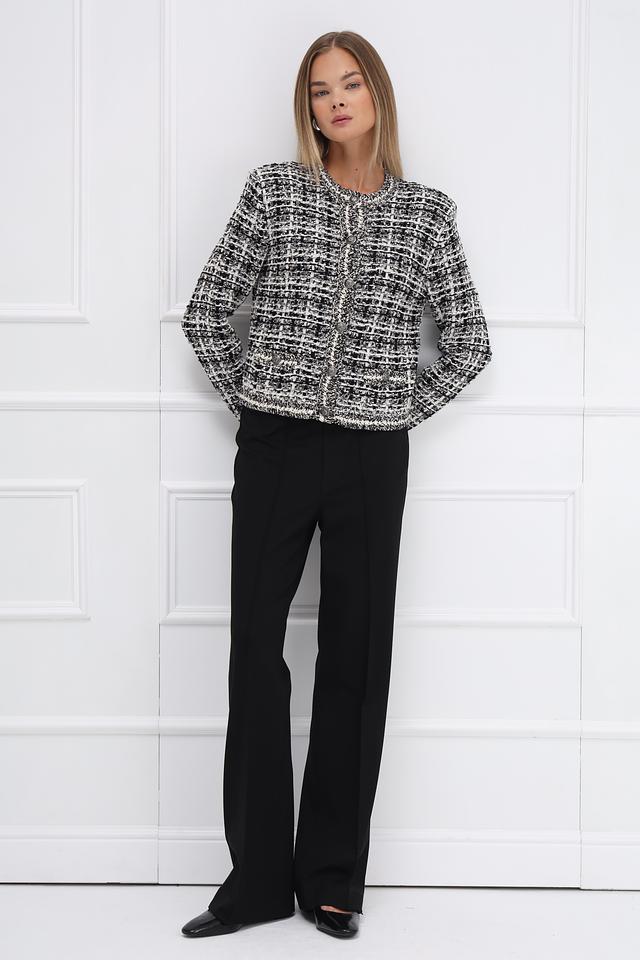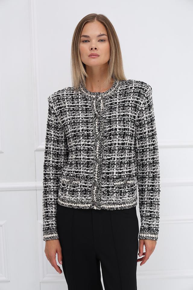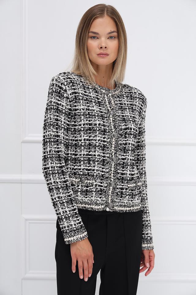 Жакет Oui чёрно-белого цвета – стильная и универсальная модель. Изготовлен из смесового хлопка с добавлением полиэстера и акрила, что обеспечивает комфорт и износостойкость. Состав: хлопок 62%, полиэстер 21%, полиакрил 9%, полиамид 4%, метализ.нить 4%