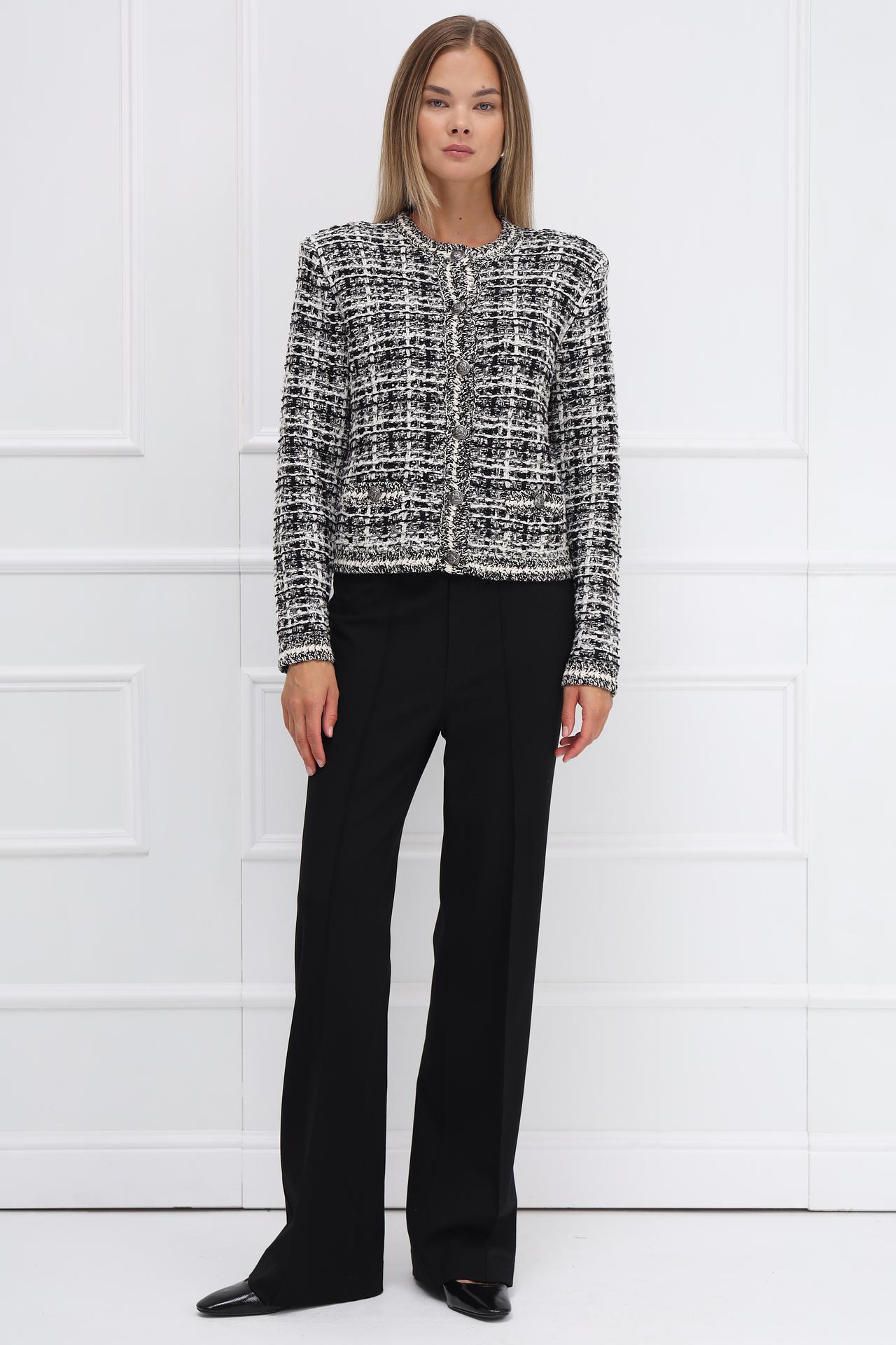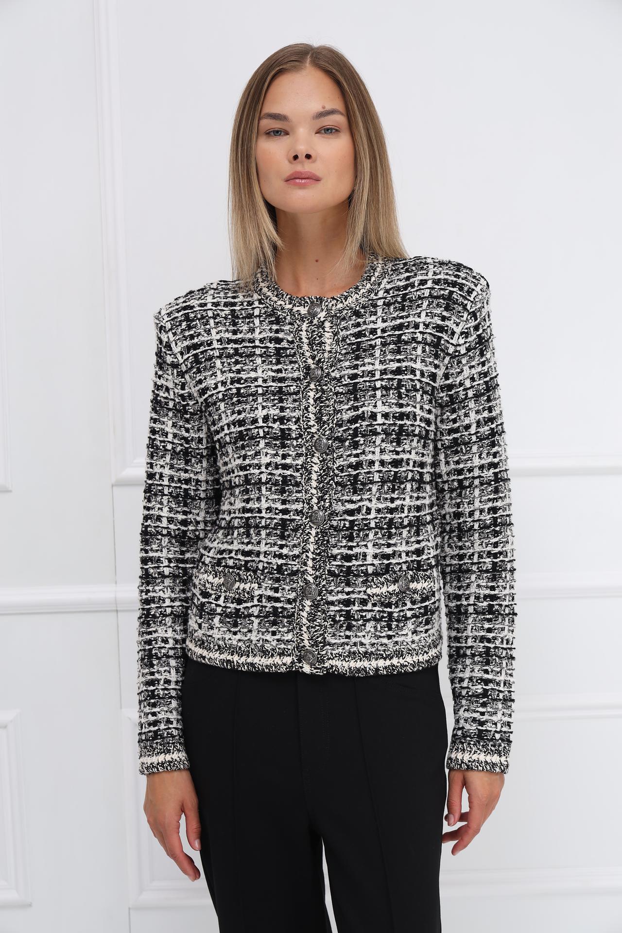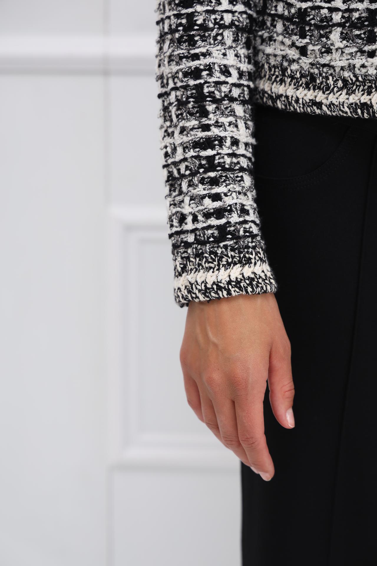 - Универсальность стиля: Чёрно-белый твид легко сочетается с разнообразными элементами гардероба – от классических брюк и юбок до джинсов, позволяя создавать множество стильных и женственных комплектов. Это незаменимая вещь для межсезонья и прохладных летних вечеров.