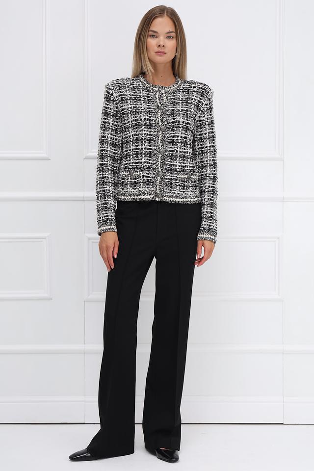 Жакет имеет текстурированную поверхность благодаря использованию ткани в клетку. Сочетание хлопка, полиэстера, полиакрила, полиамида и метализированной нити обеспечивает приятные тактильные ощущения и долговечность изделия.