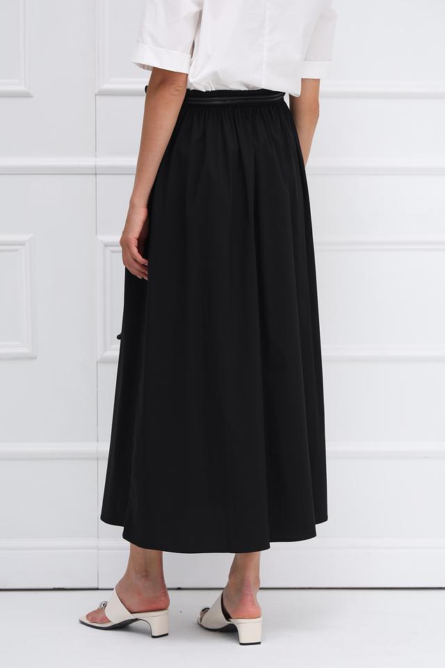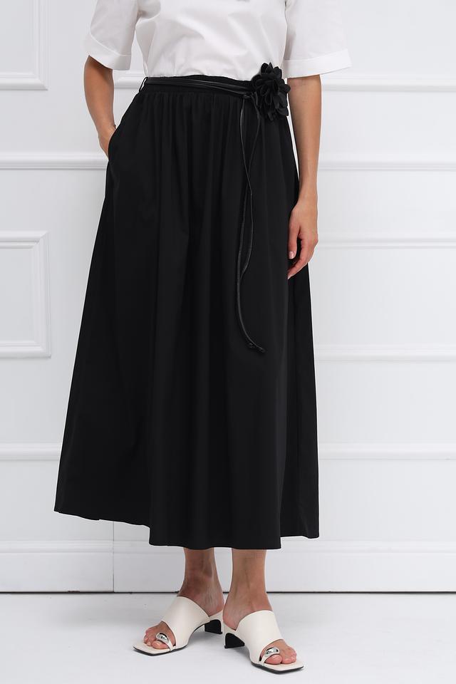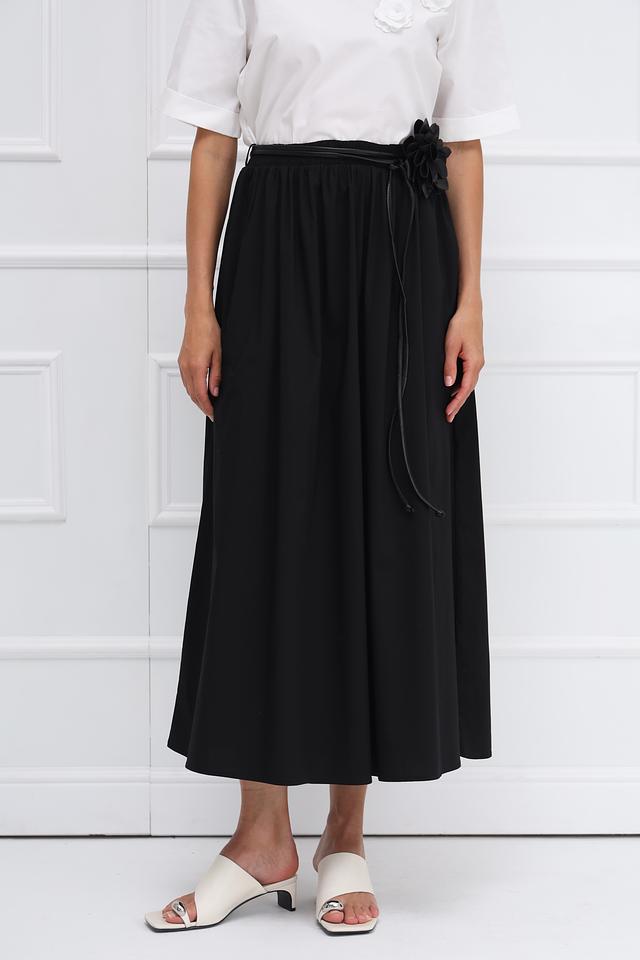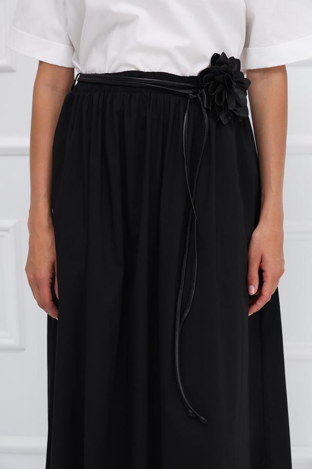 Модель имеет длину миди и свободный крой, обеспечивающий свободу движений. Особенностью юбки является декоративный пояс с шнуровкой и небольшим цветочным элементом, который придает образу женственность и изысканность.