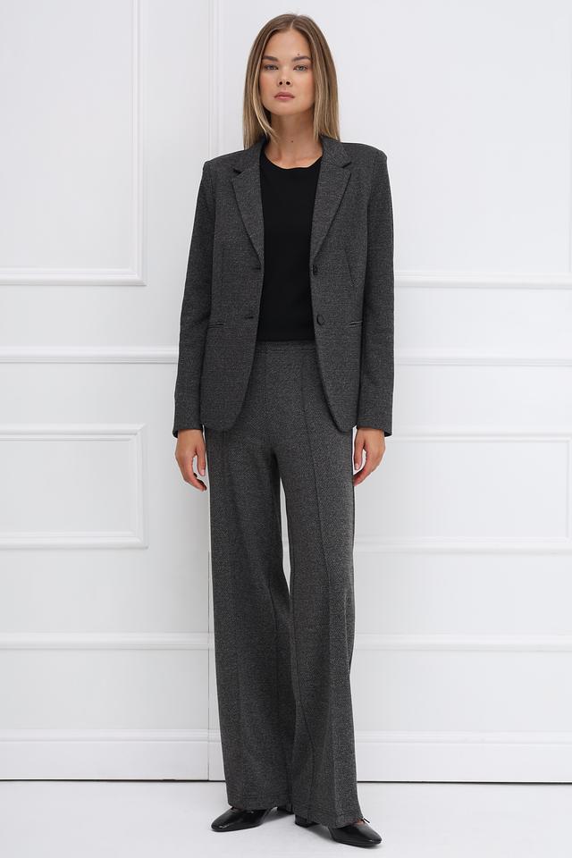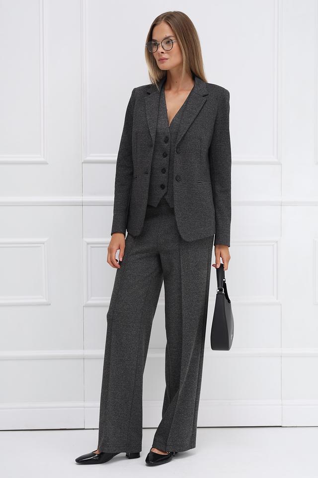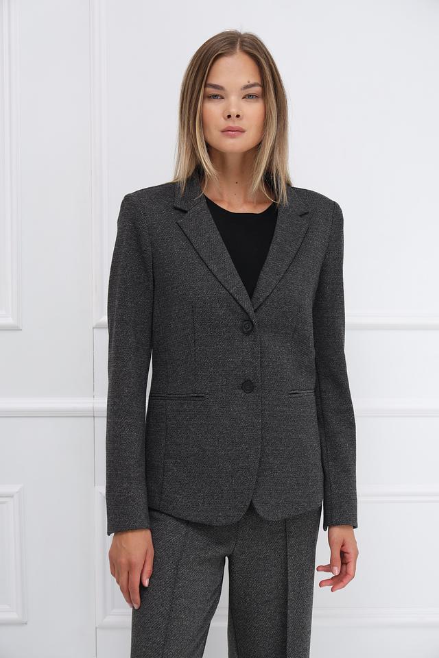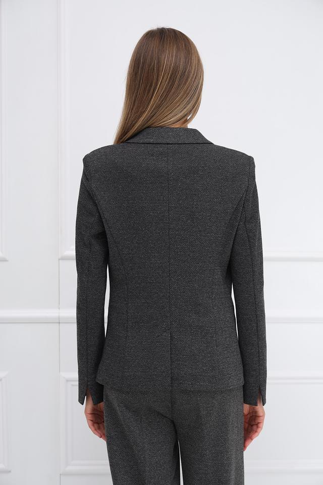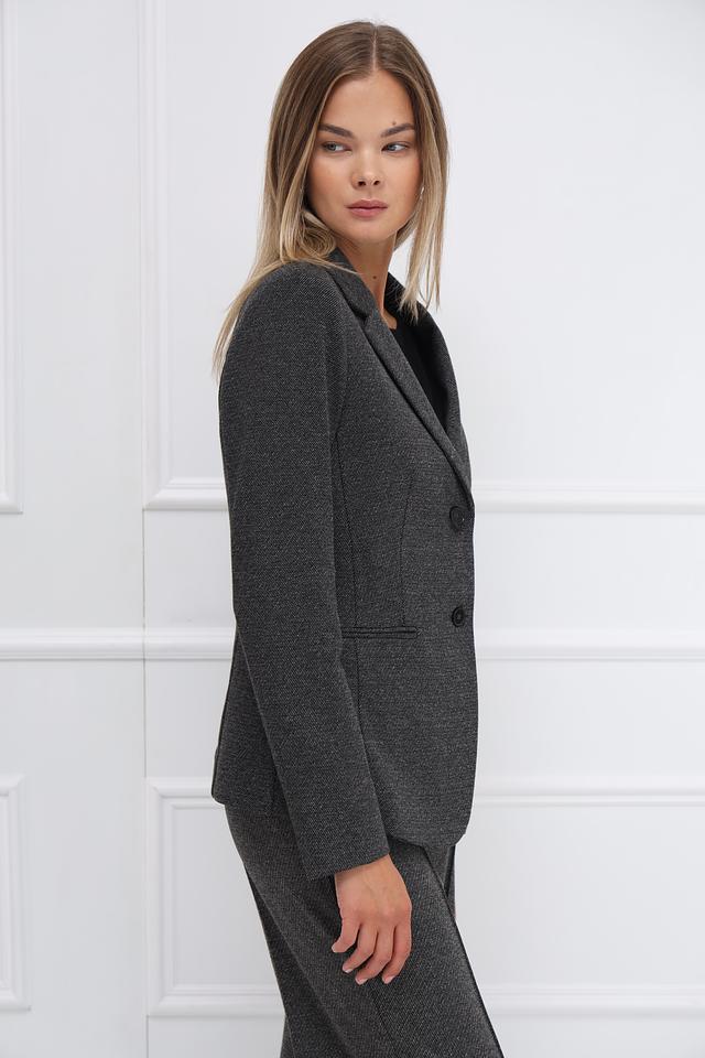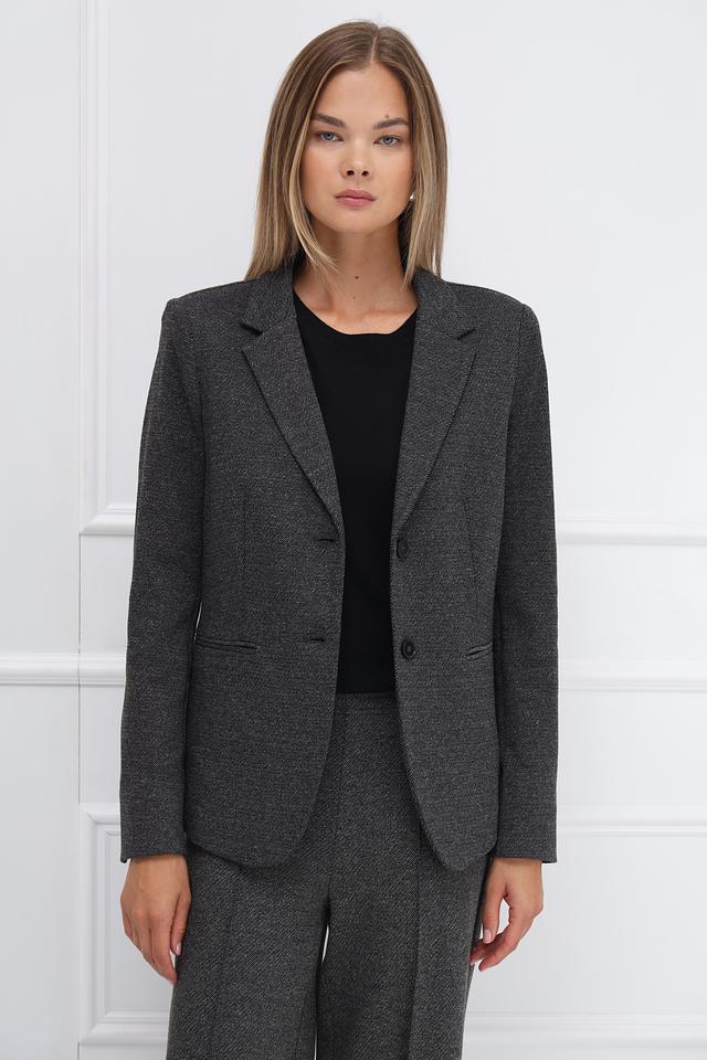 Модель имеет приталенный силуэт, который подчеркивает фигуру. Застежка на три пуговицы обеспечивает удобство ношения. Жакет имеет длинные рукава и лацканы классической формы.