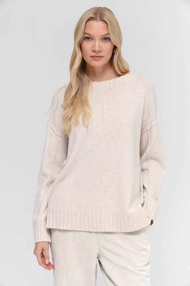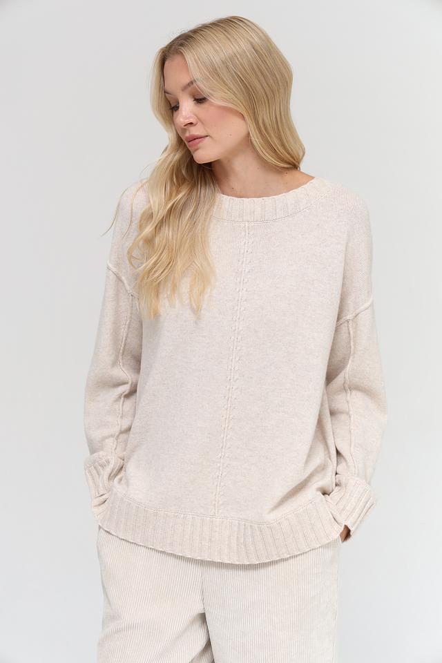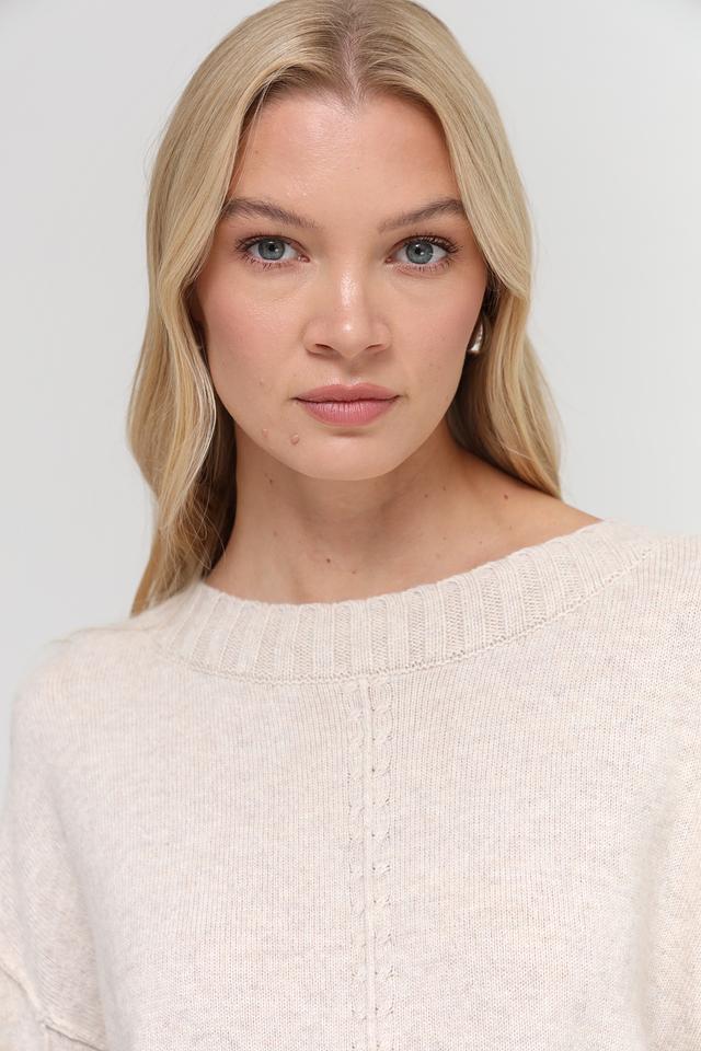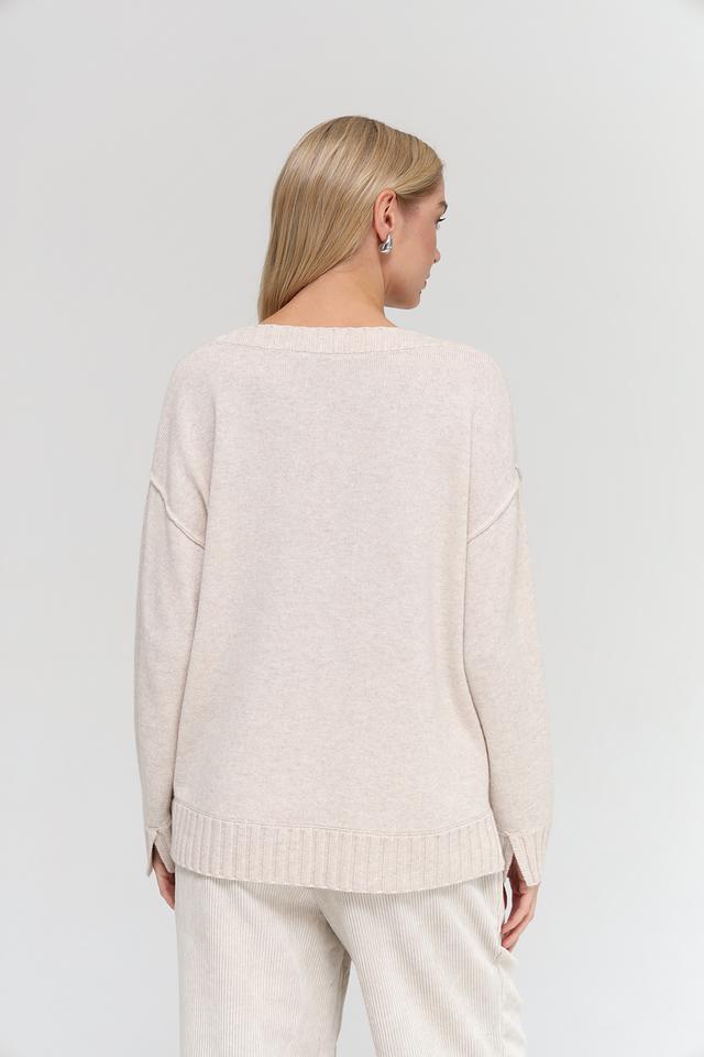Пуловер имеет свободный крой, который обеспечивает комфорт и свободу движений. Округлый вырез горловины и длинные рукава делают его универсальным для различных образов. Декоративная вязка на плечах и лицевой стороне добавляет изделию изысканности.