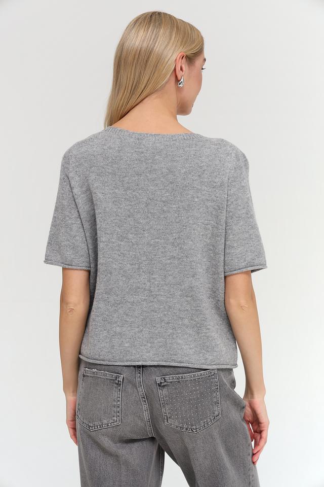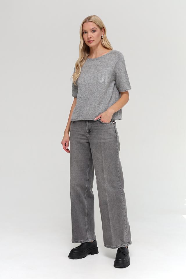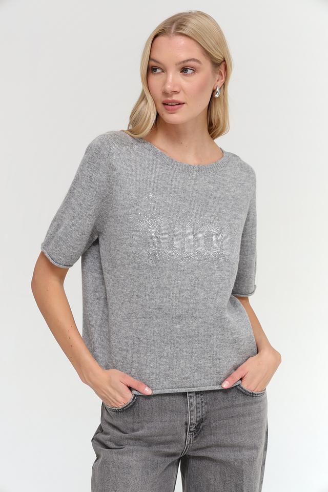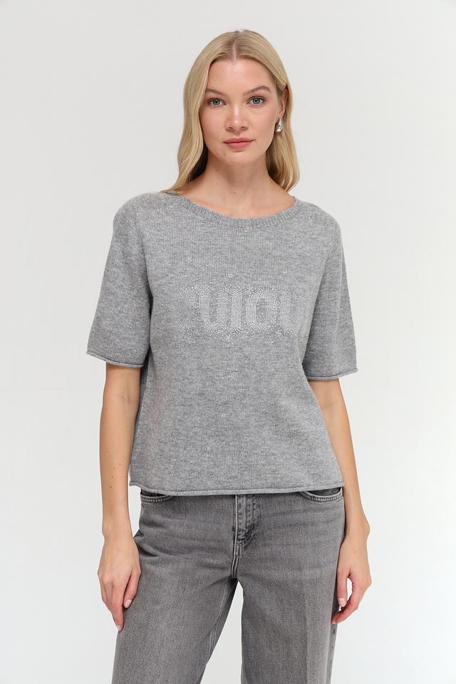 Серый пуловер Oui из смесового трикотажа с короткими рукавами, украшенный стразами. Состав: полиамид, шерсть, полиакрил. Состав: полиамид 50%, шерсть 35%, полиакрил 15%