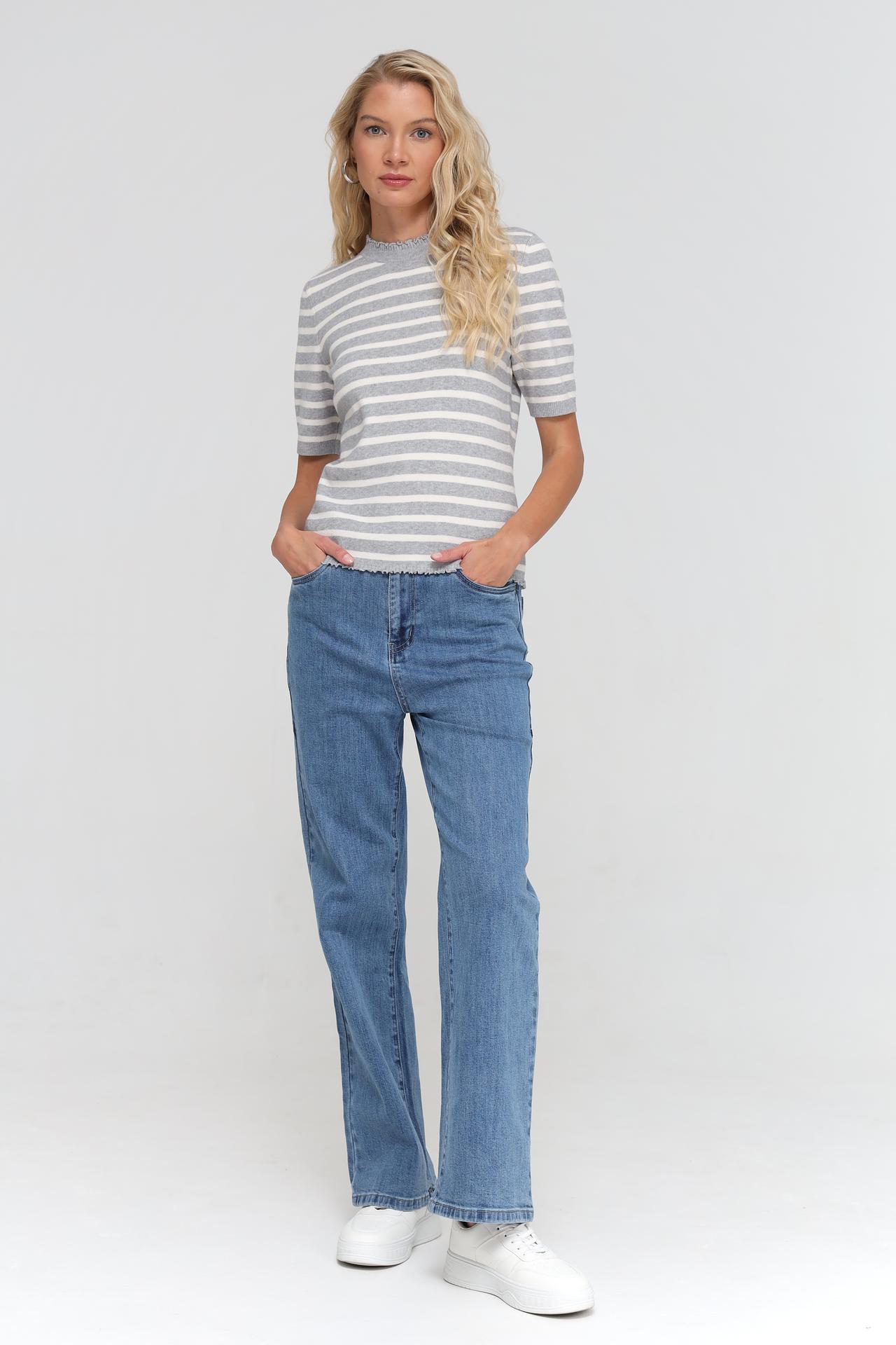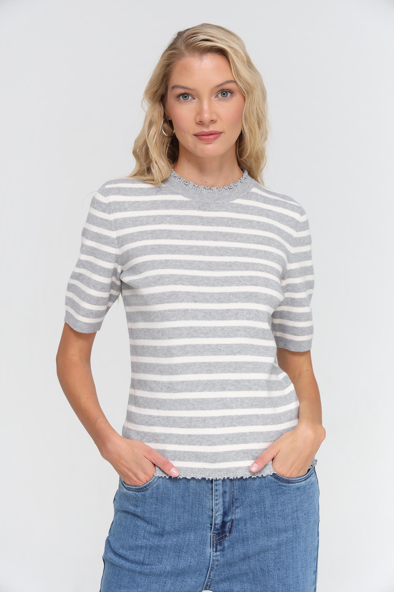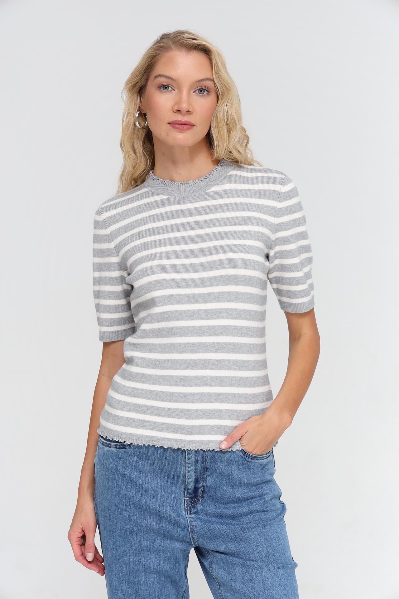 - Дизайн: Классический пуловер в полоску с коротким рукавом и округлым вырезом горловины, дополненный деликатной отделкой по краю.
