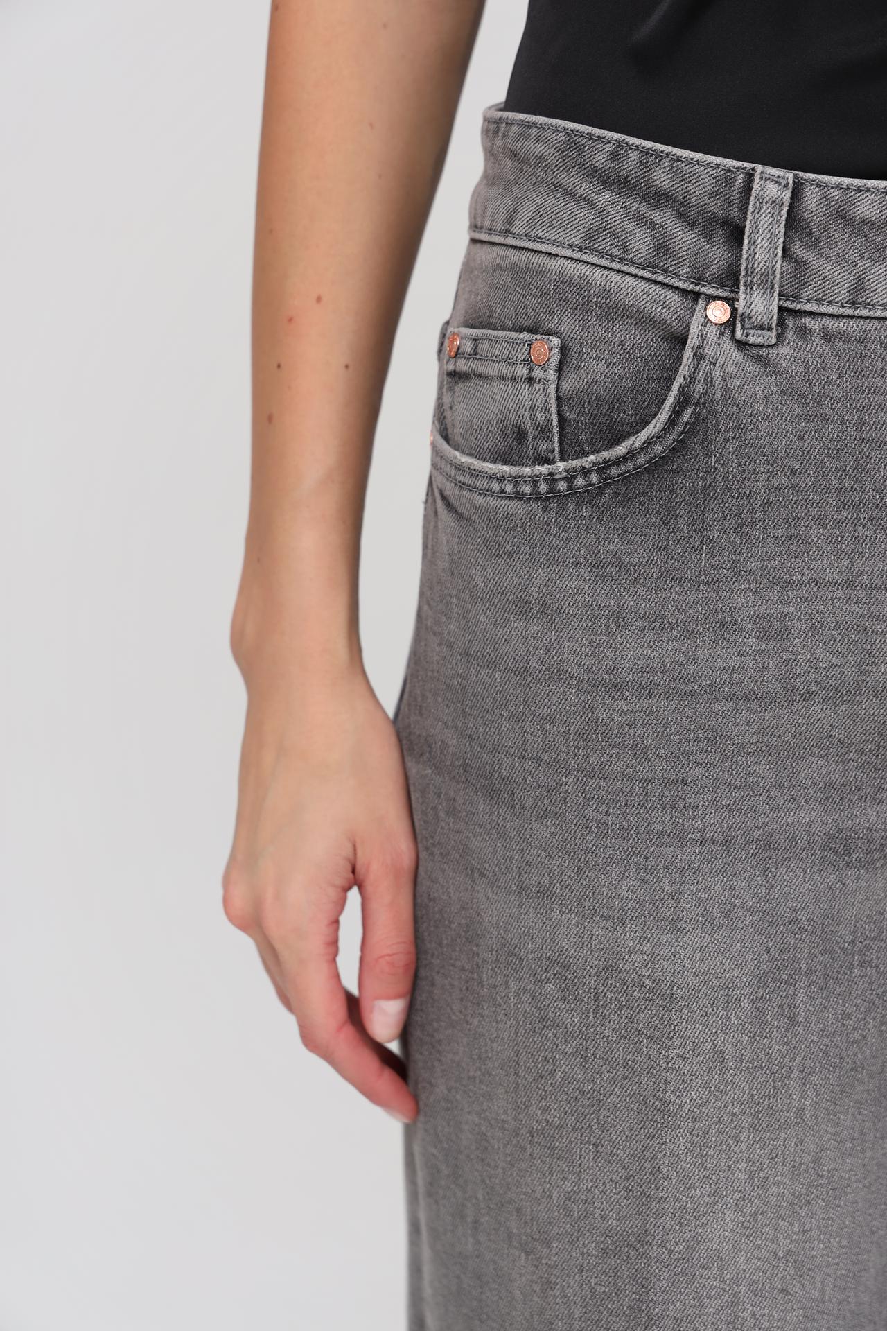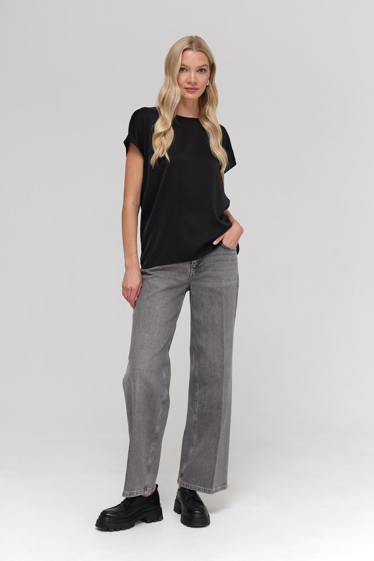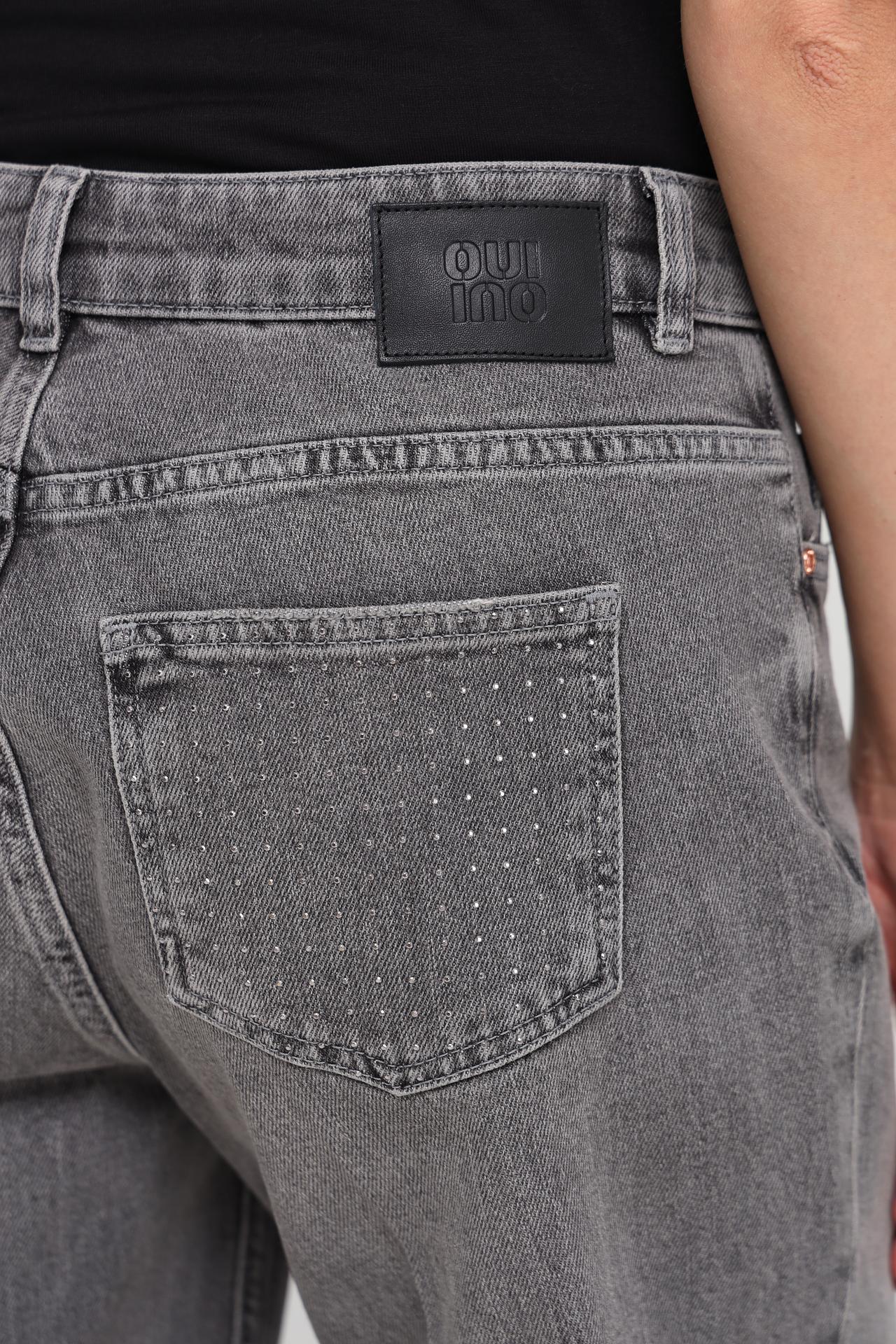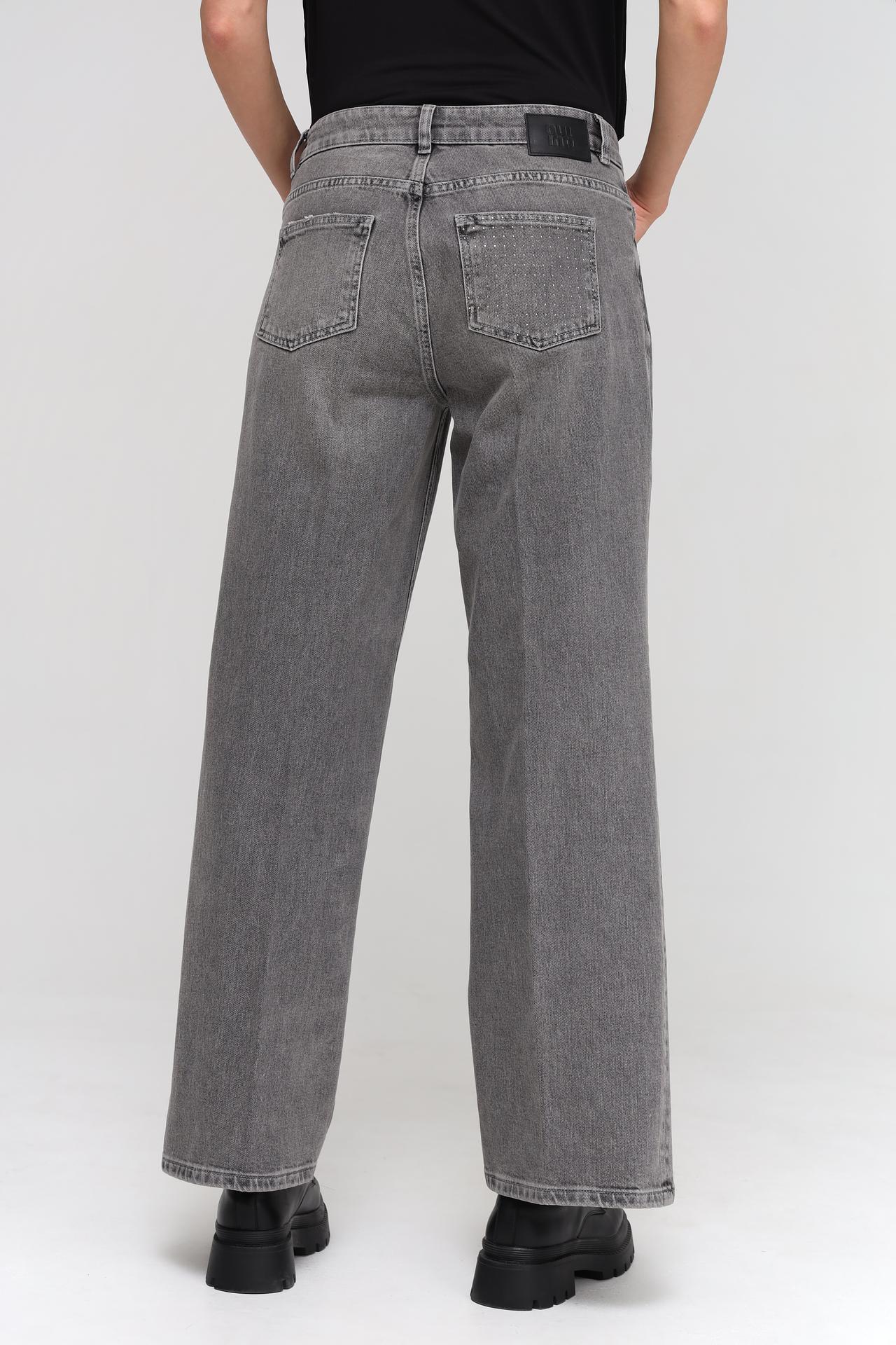 Универсальный серый цвет легко вписывается в любой гардероб, а прямой крой и высокая посадка подчеркивают достоинства фигуры. Декоративная отделка в виде мелких страз на задних карманах добавляет изысканности и особого шарма.