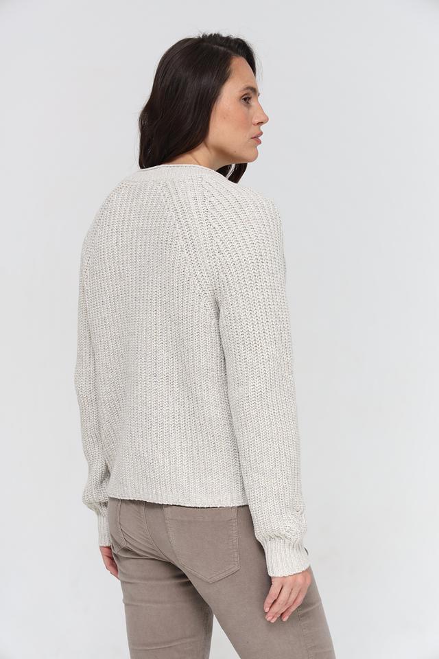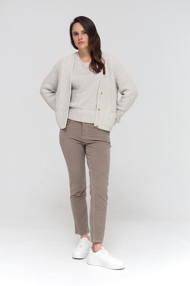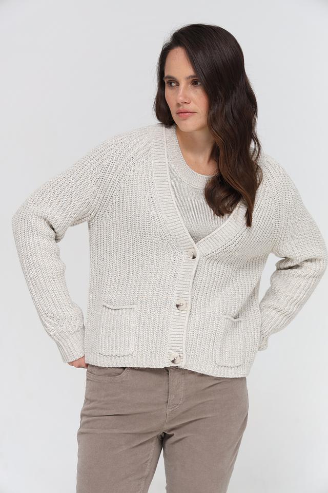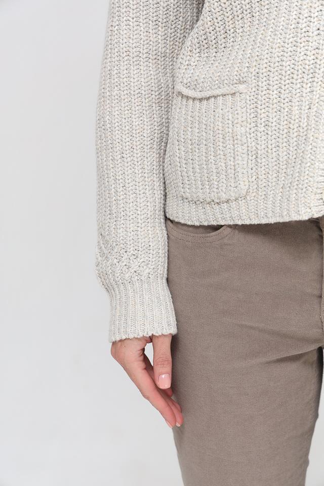 Жакет имеет классический крой с V-образным вырезом и застёжкой на пуговицы. Накладные карманы добавляют практичности и непринуждённости образу. Крупная вязка придает изделию объём и текстуру.
