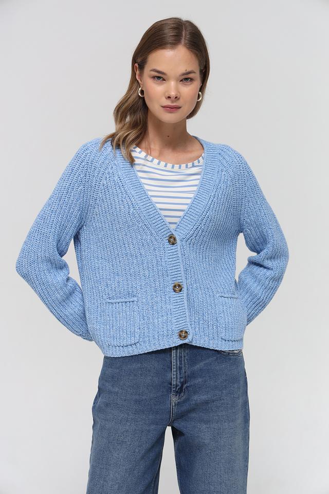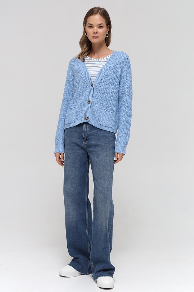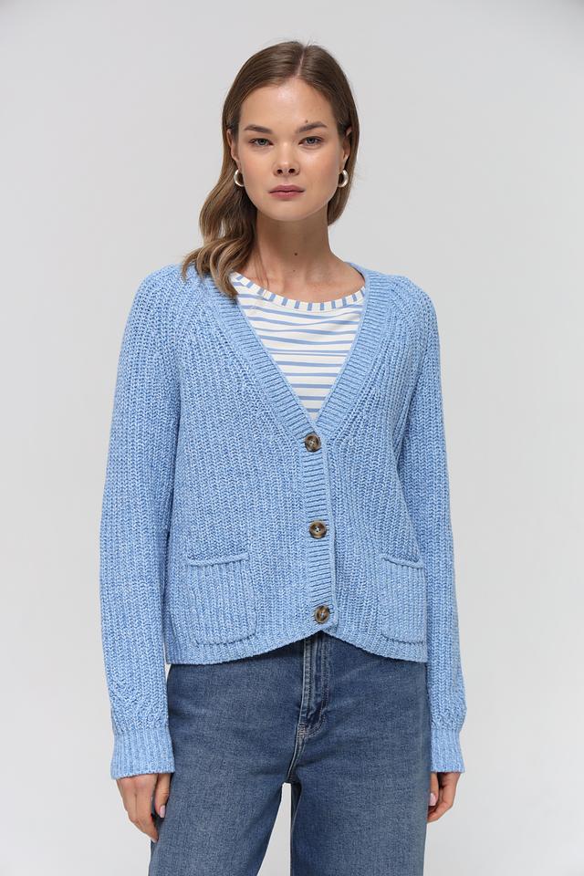 Голубой вязаный жакет от Oui – это удобная и стильная модель кардигана на пуговицах. Жакет имеет классический крой, два накладных кармана и выполнен из мягкого хлопкового трикотажа. Состав: хлопок 56%, полиакрил 38%, полиэстер 6%