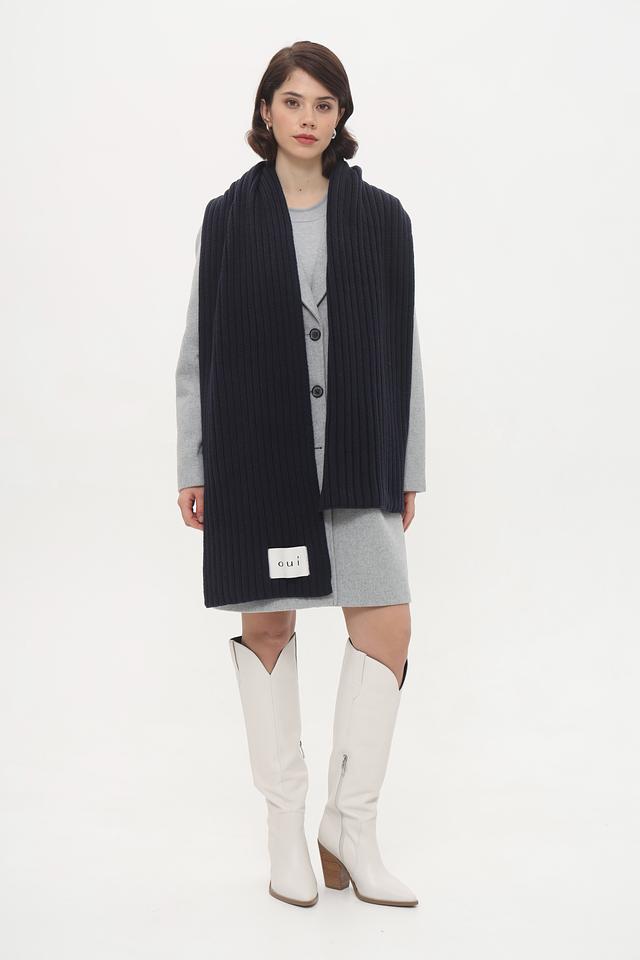 Шарф имеет прямоугольную форму и выполнен из мягкой и приятной на ощупь смеси хлопка и полиакрила. Фактурная вязка придает изделию объем и оригинальность. На одном из концов шарфа расположен небольшой лейбл с логотипом бренда Oui.