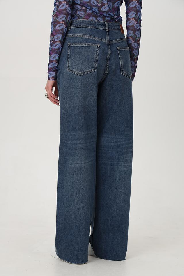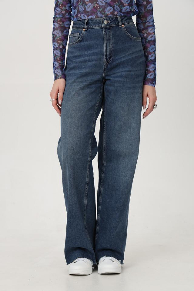 Джинсы имеют высокую посадку и свободный, широкий крой, что делает их отличным выбором для создания расслабленных и стильных образов. Классический синий цвет легко сочетается с различными элементами гардероба.