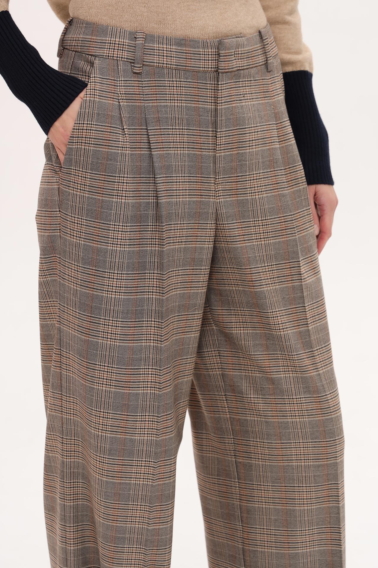 - Дизайн: Классическая клетка в серо-коричневых тонах. Аккуратные стрелки визуально удлиняют ноги, а боковые карманы добавляют практичности.