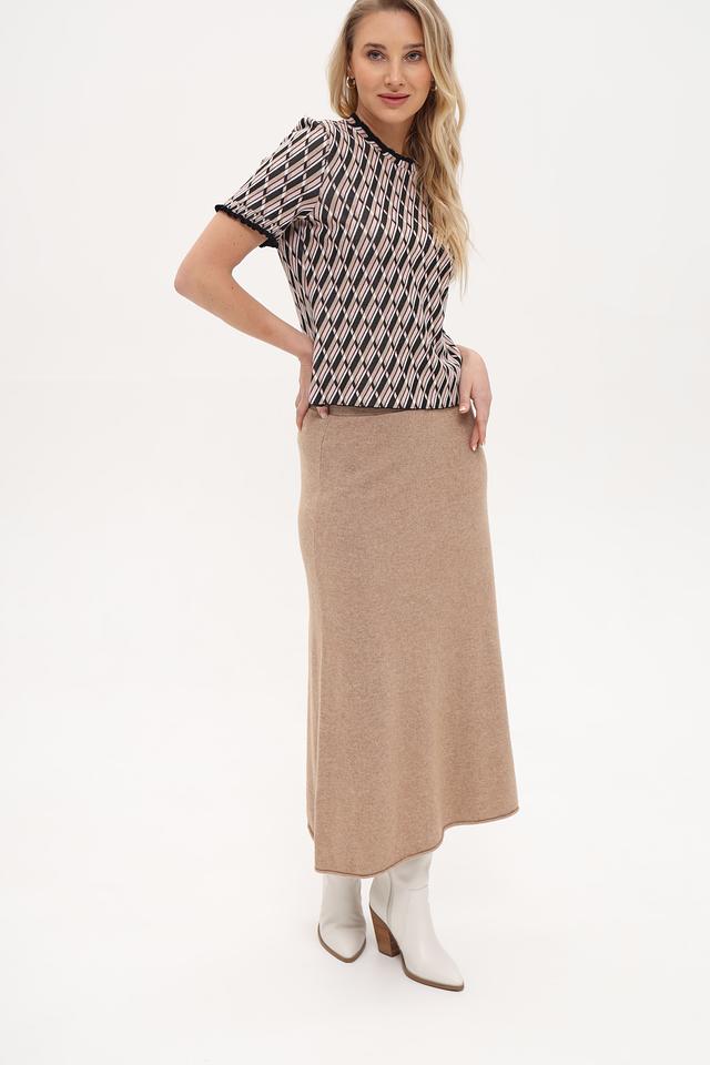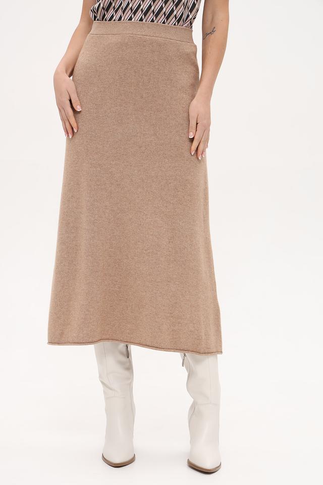 Юбка имеет прямую, слегка расклешенную форму и длину миди. Эластичный пояс обеспечивает удобную посадку по фигуре. Текстура вязаного полотна придает юбке особый шарм и делает ее универсальной для различных стилей.