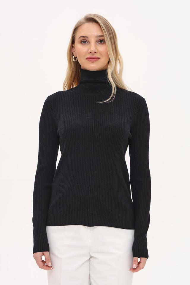 Чёрная водолазка от Oui выполнена из мягкого трикотажа с добавлением шёлка и кашемира. Классический крой и изящная текстура делают эту модель универсальным элементом гардероба. Состав: хлопок 47%, вискоза 43%, шелк 8%, кашемир 2%