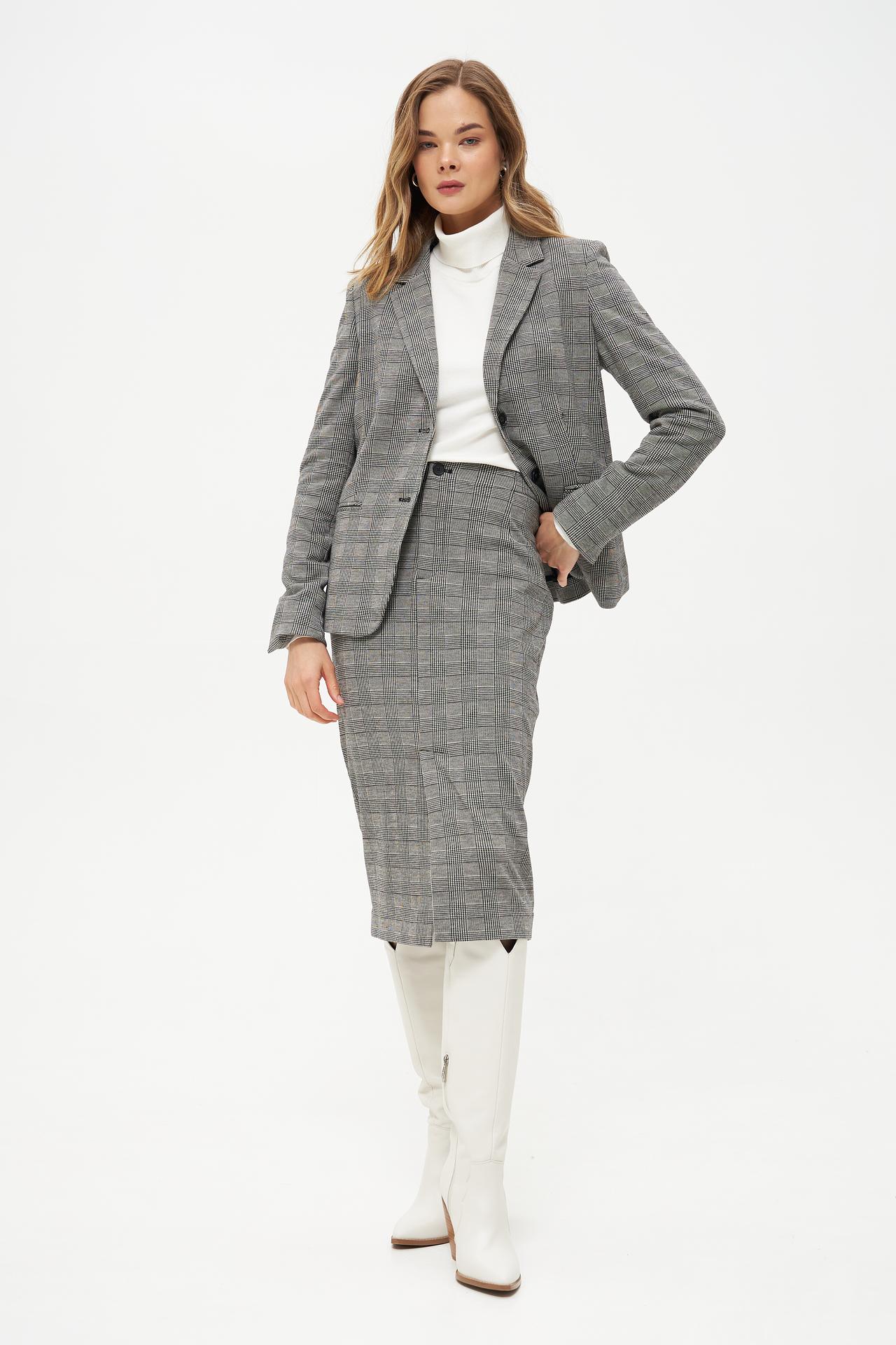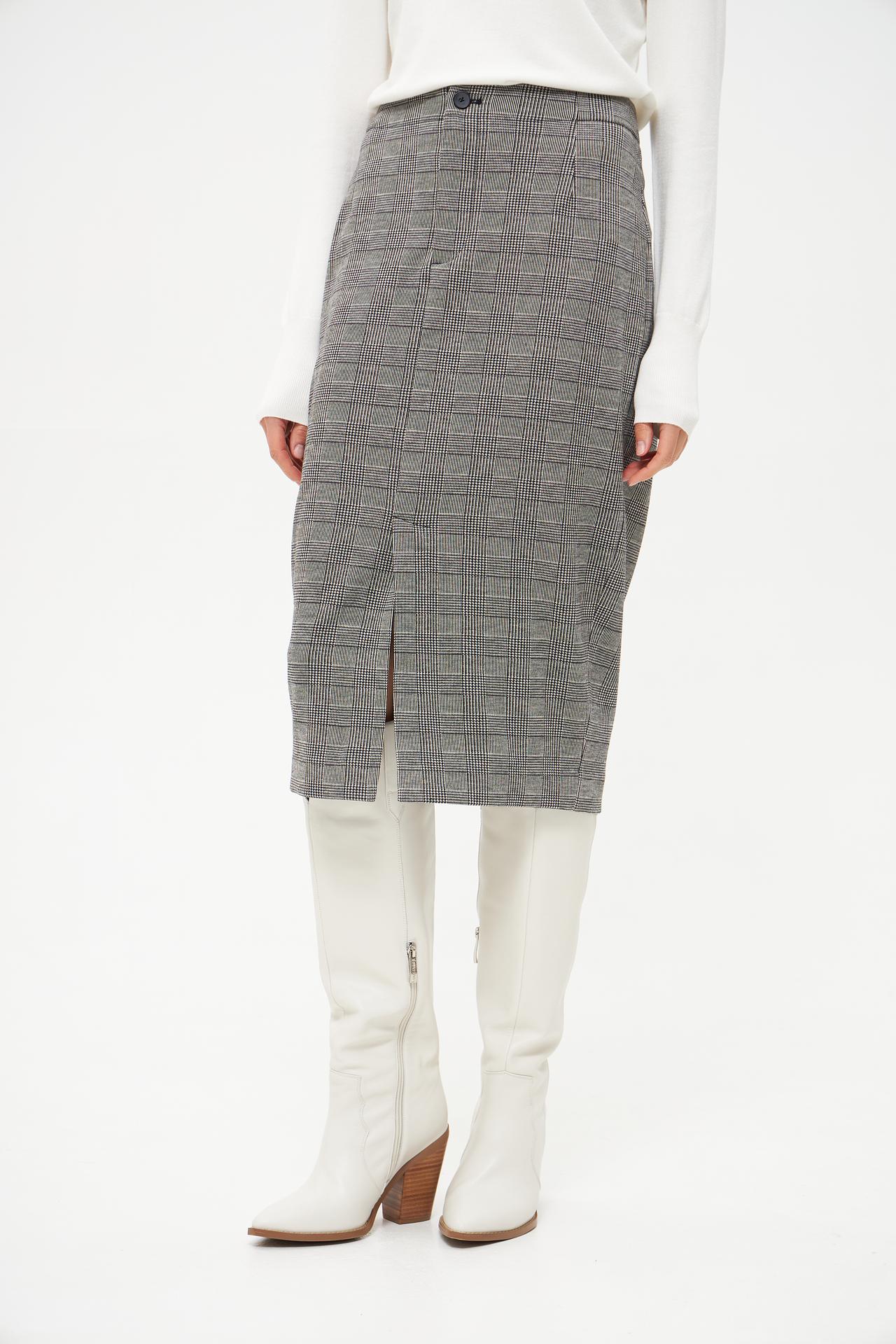 - Дизайн: Юбка прямого кроя длиной до колена с небольшим разрезом спереди. Модель украшена принтом в клетку и дополнена одной пуговицей на поясе.