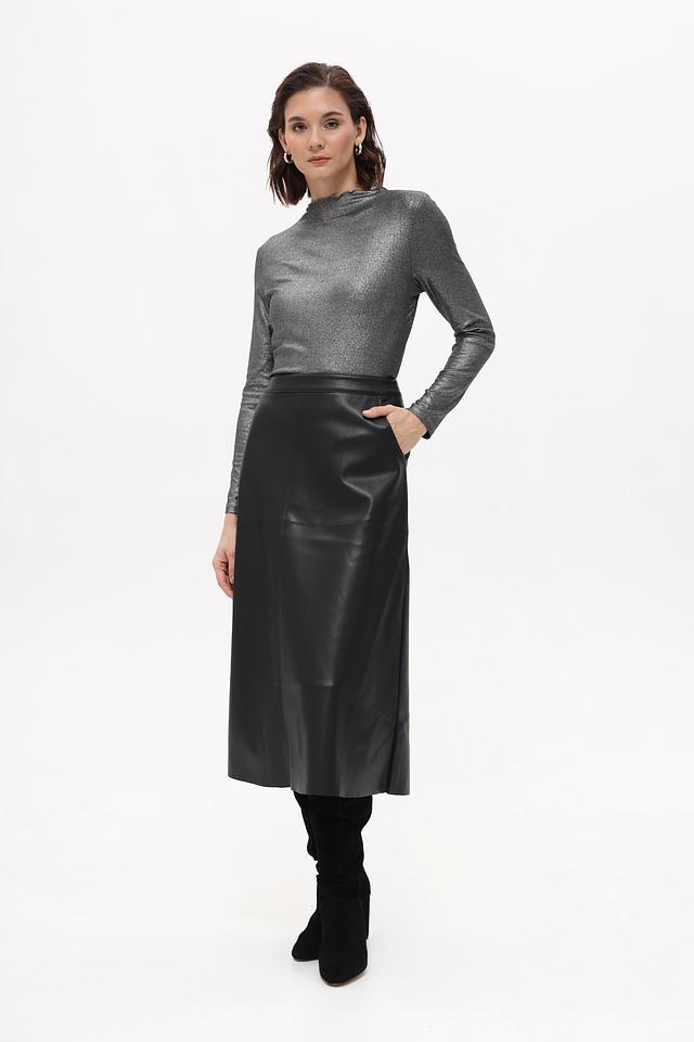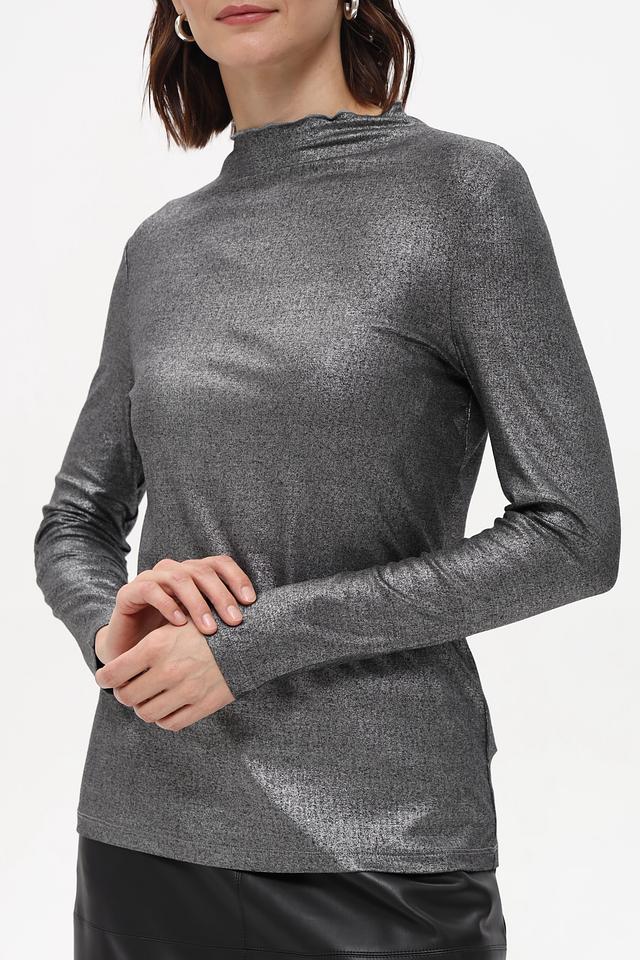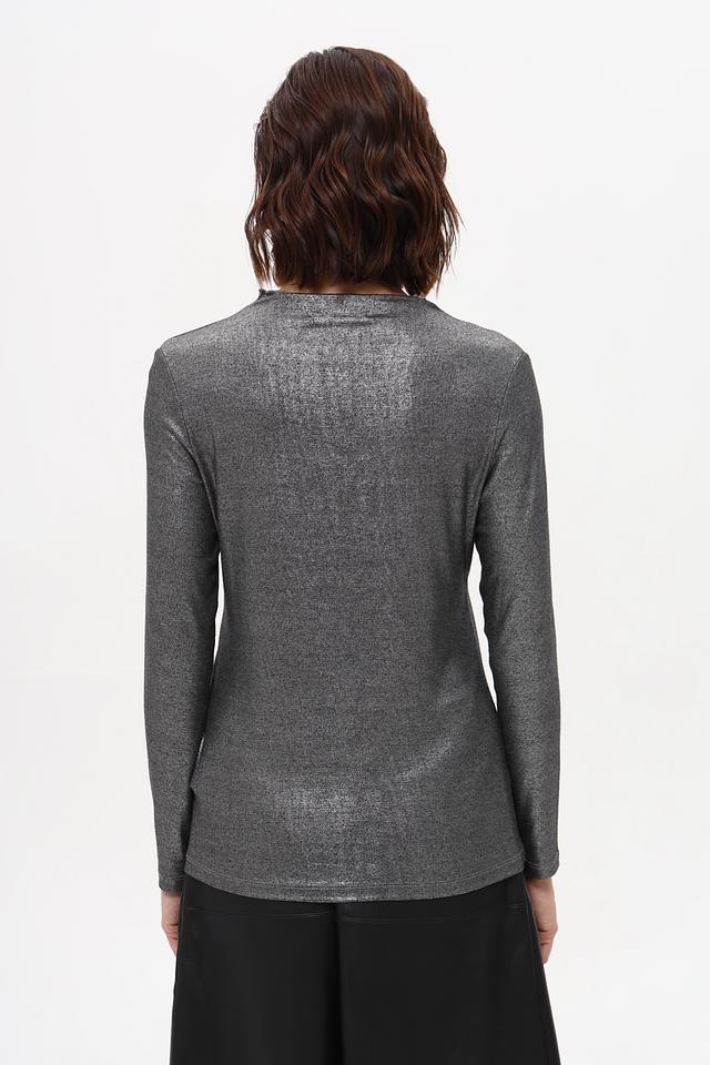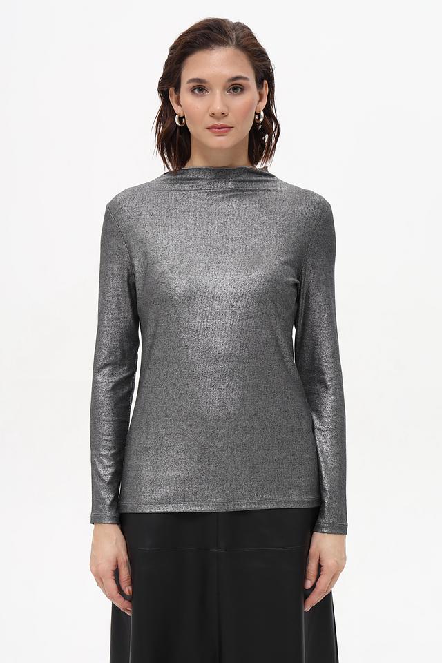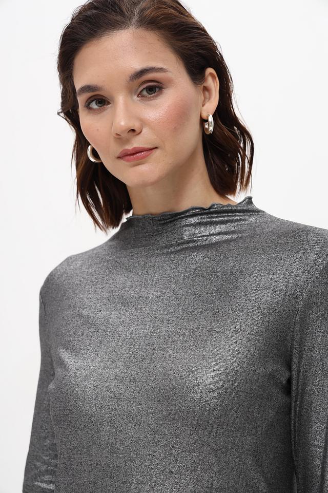 Футболка имеет прямой крой и длинные рукава. Особый акцент сделан на мерцающую текстуру ткани, которая придает образу праздничность и изысканность. Высокий округлый воротник добавляет элегантности.