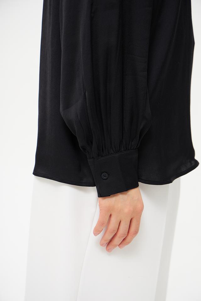 Блуза имеет классический чёрный цвет, который легко сочетается с различными элементами одежды. Воротник-стойка придает образу элегантность и изысканность. Длинные рукава с манжетами добавляют завершенности силуэту.