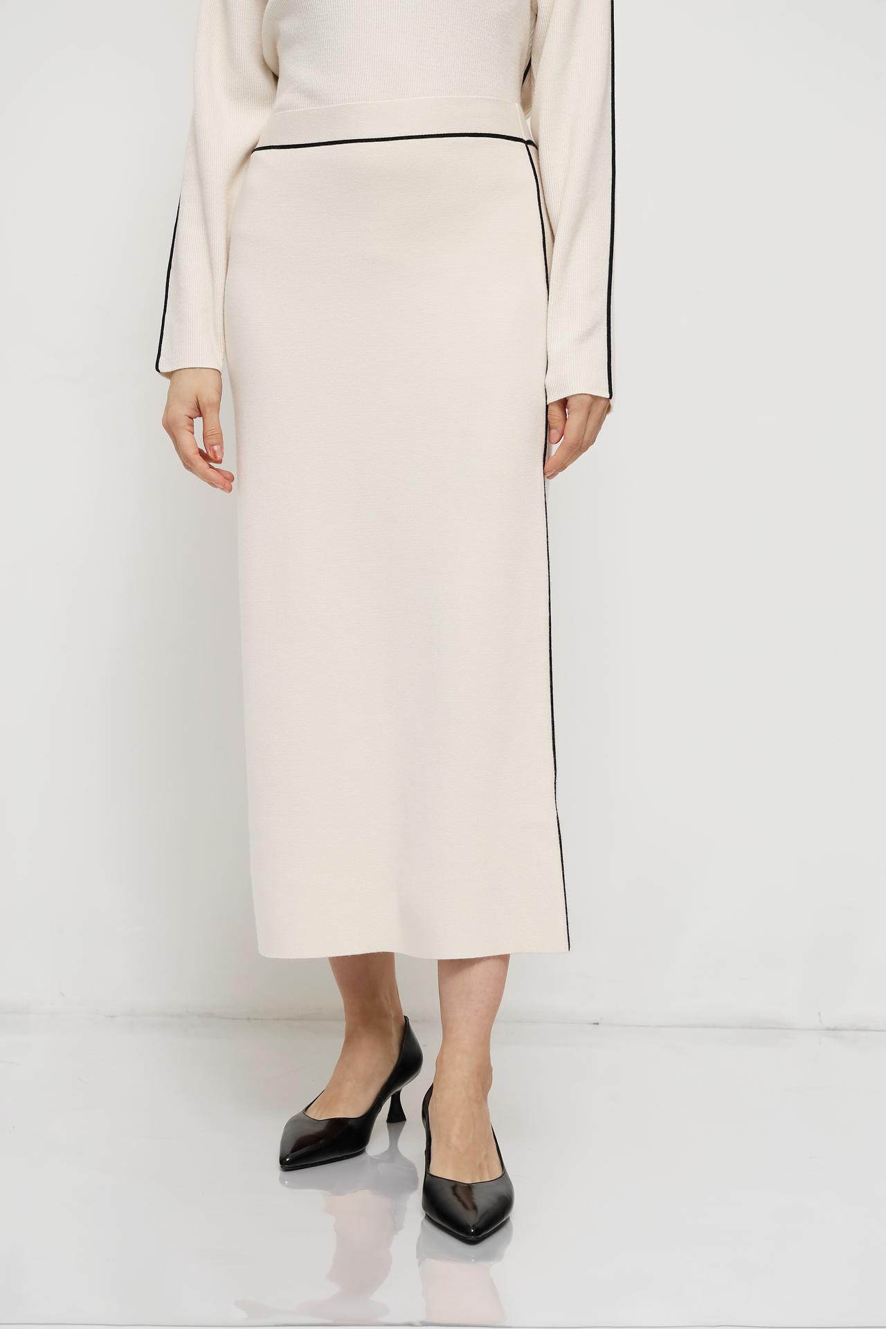 - Контрастная отделка: Чёрная окантовка по швам и поясу придаёт изделию графичность и современный вид, подчёркивая линии силуэта и добавляя изысканности. Это стильный акцент, который делает юбку уникальной.