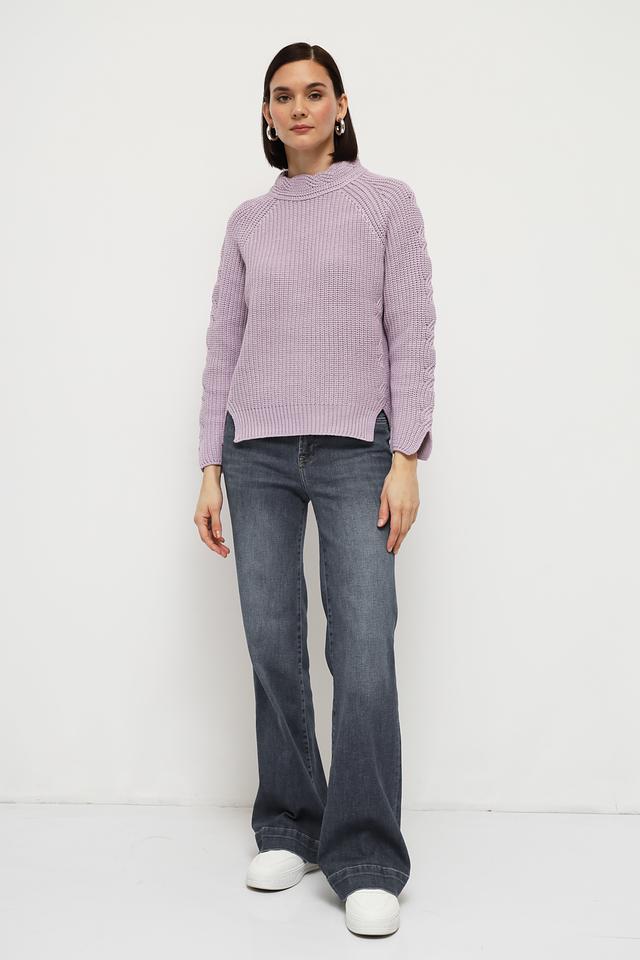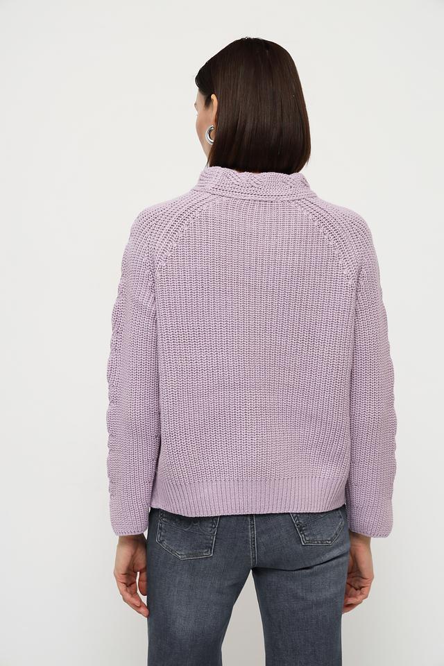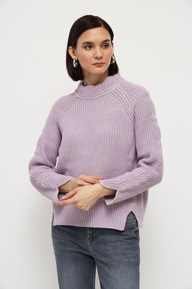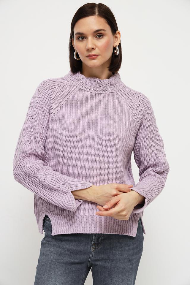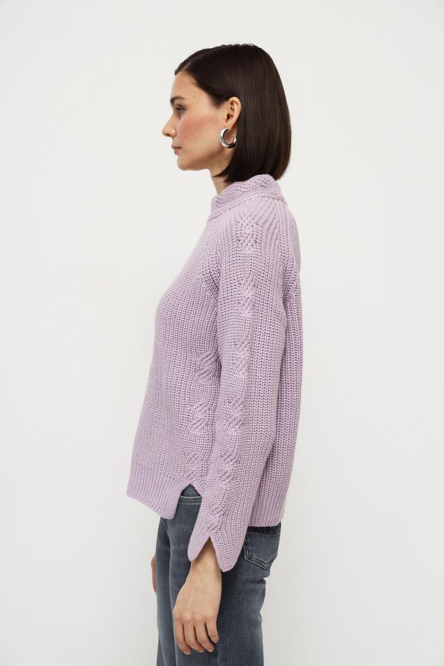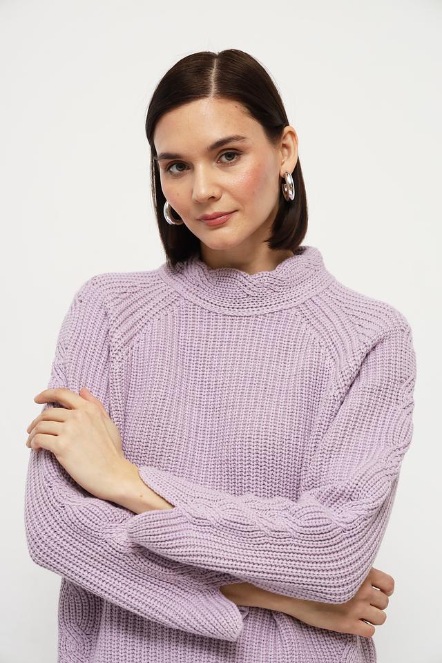 Пуловер имеет лавандовый оттенок и свободный крой, который не сковывает движения. Особое внимание привлекает выразительная текстура вязания с косами, придающая изделию оригинальность и объём. Высокий воротник-стойка добавляет элегантности и защищает от холода.