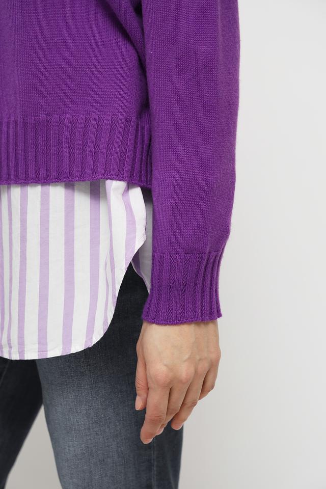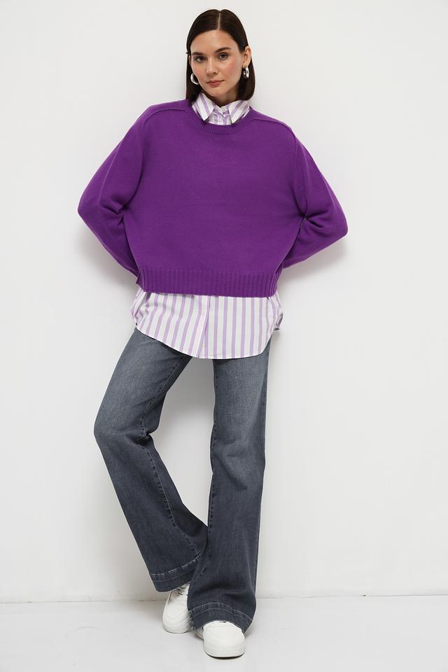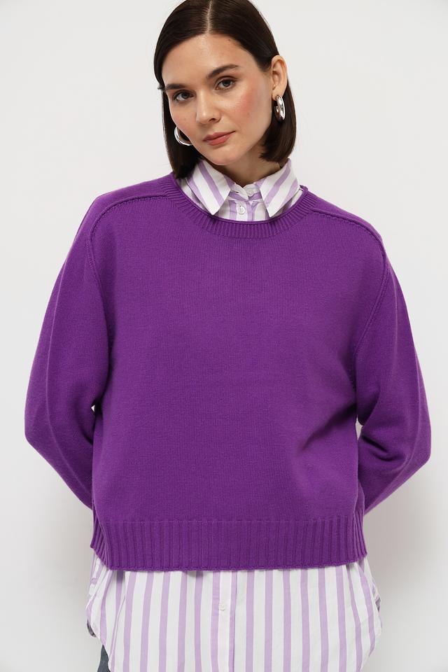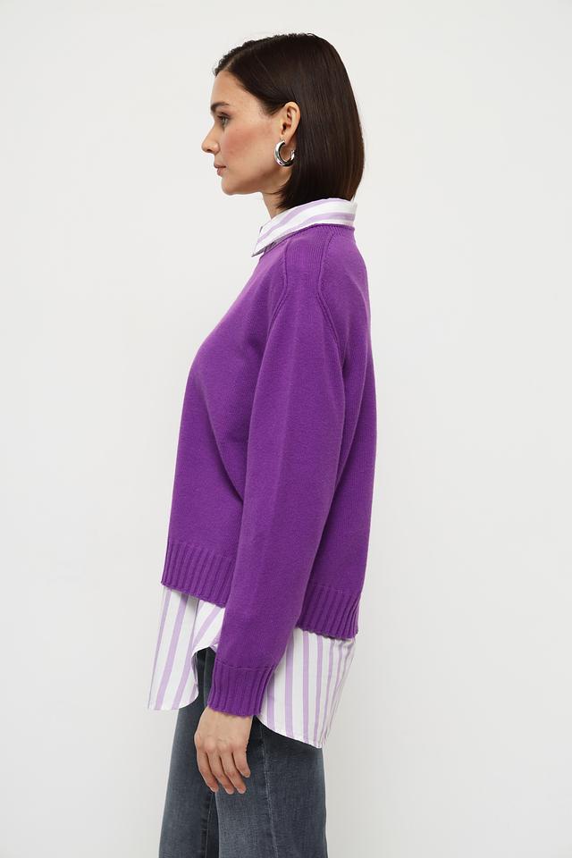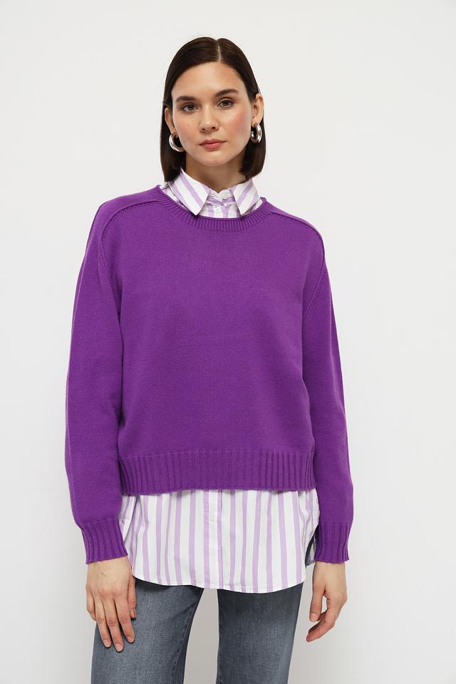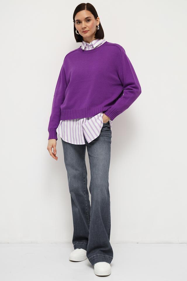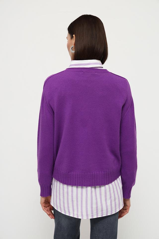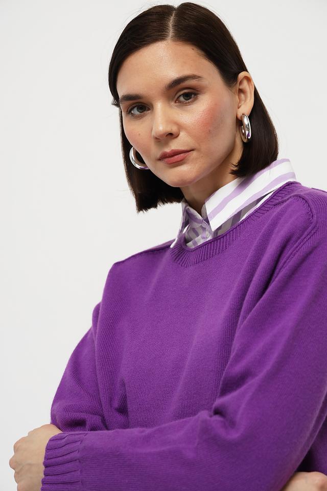 Пуловер имеет классический крой с круглым вырезом горловины и длинными рукавами. Его насыщенный фиолетовый цвет добавит яркости и индивидуальности вашему образу. Эластичный низ изделия обеспечивает удобную посадку по фигуре.