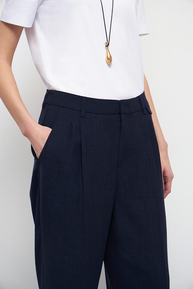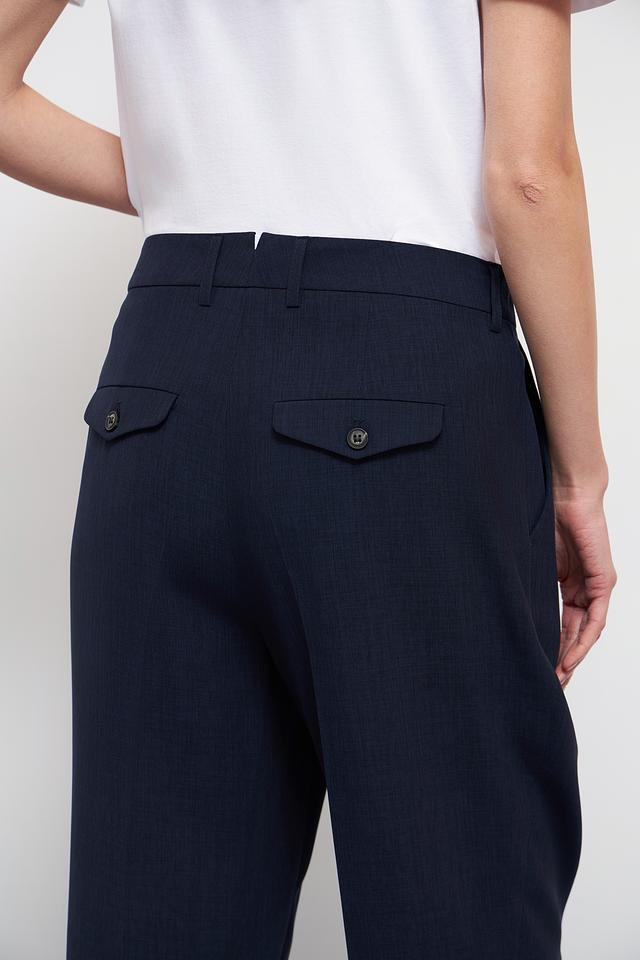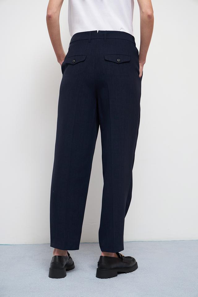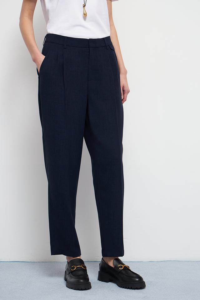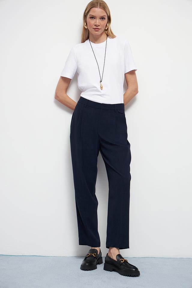 Дизайн брюк дополнен аккуратными складками спереди, которые придают им более формальный и изысканный вид. Модель идеально подходит для создания деловых образов, а также для повседневной носки в сочетании с различными топами и блузками.