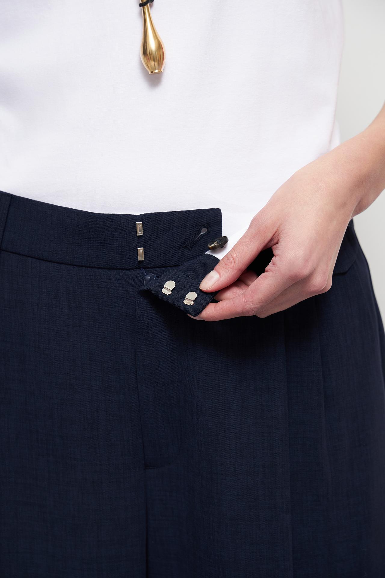 - Функциональные детали. Модель оснащена удобными боковыми карманами и аккуратными прорезными карманами сзади на пуговицах, а также скрытой застежкой на молнию и крючки для безупречного внешнего вида.