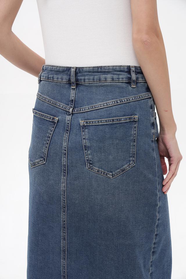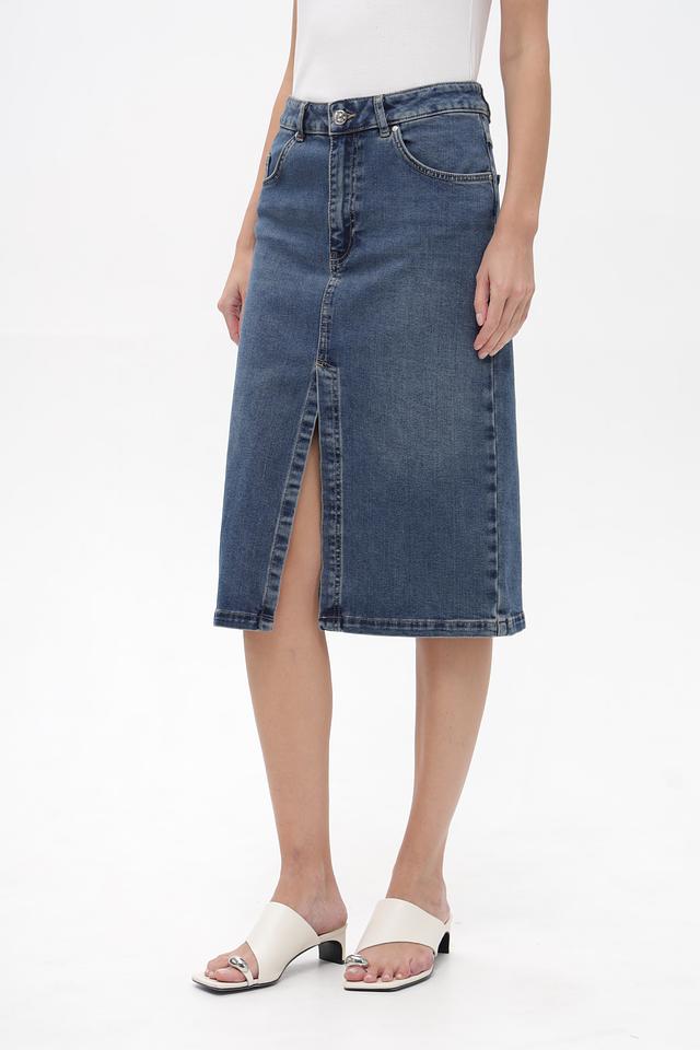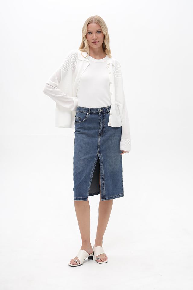 Юбка имеет классический синий цвет и высокую посадку, подчеркивающую талию. Оригинальный разрез спереди добавляет образу динамичности и современности. Пять карманов – два спереди и два сзади – обеспечивают функциональность.