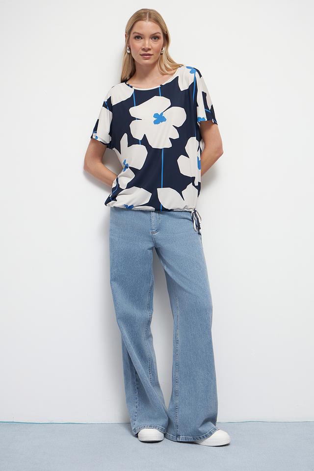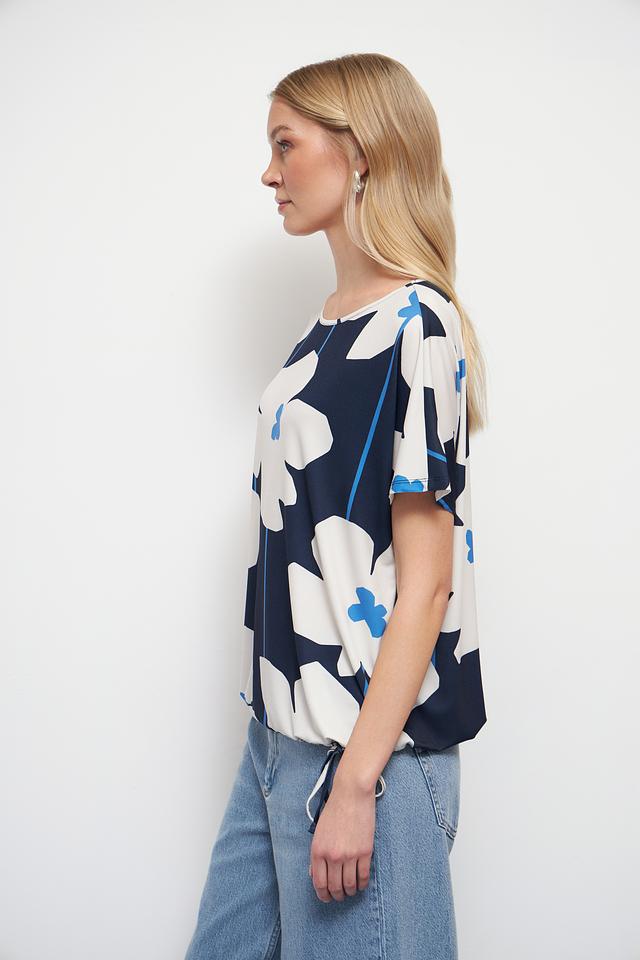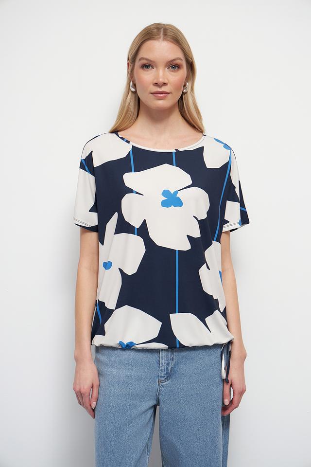 Блуза имеет свободный крой и короткие рукава, что делает ее идеальным выбором для теплой погоды. Яркий цветочный принт в синих, белых и голубых тонах добавляет образу женственности и оригинальности.