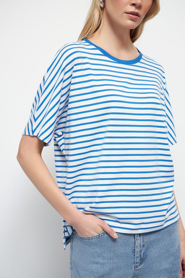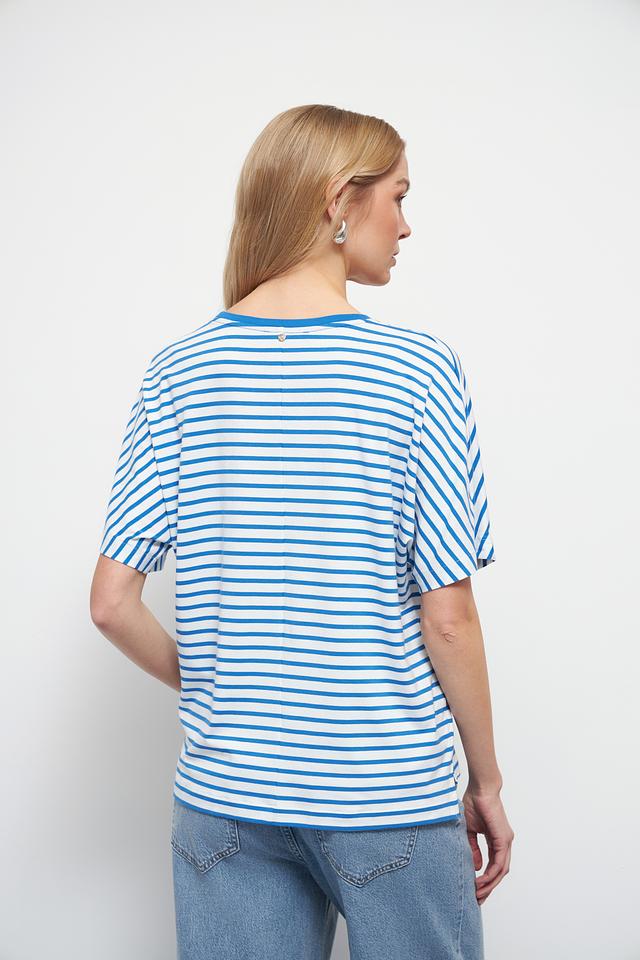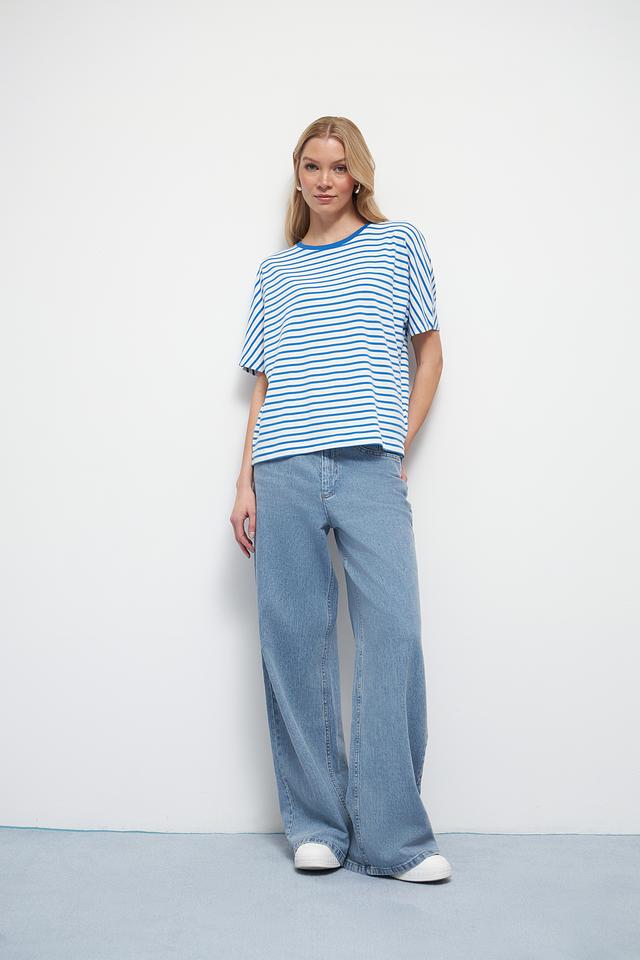 Женская футболка Oui голубого и белого цвета в классическую полоску. Изготовлена из мягкого хлопка с добавлением модала и эластана для комфорта и хорошей посадки. Состав: хлопок 47%, модал 47%, эластан 6%