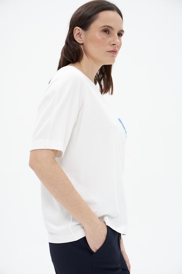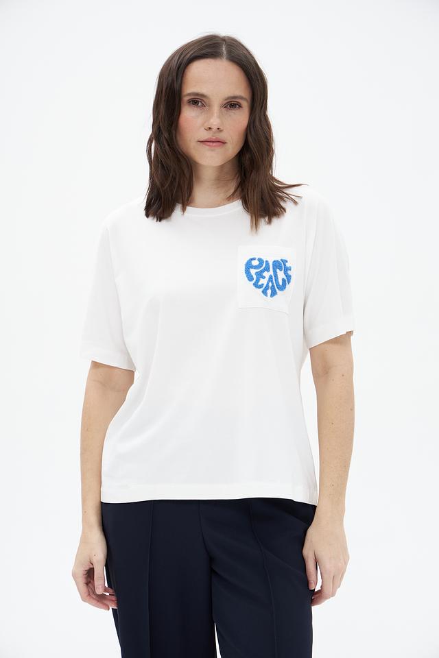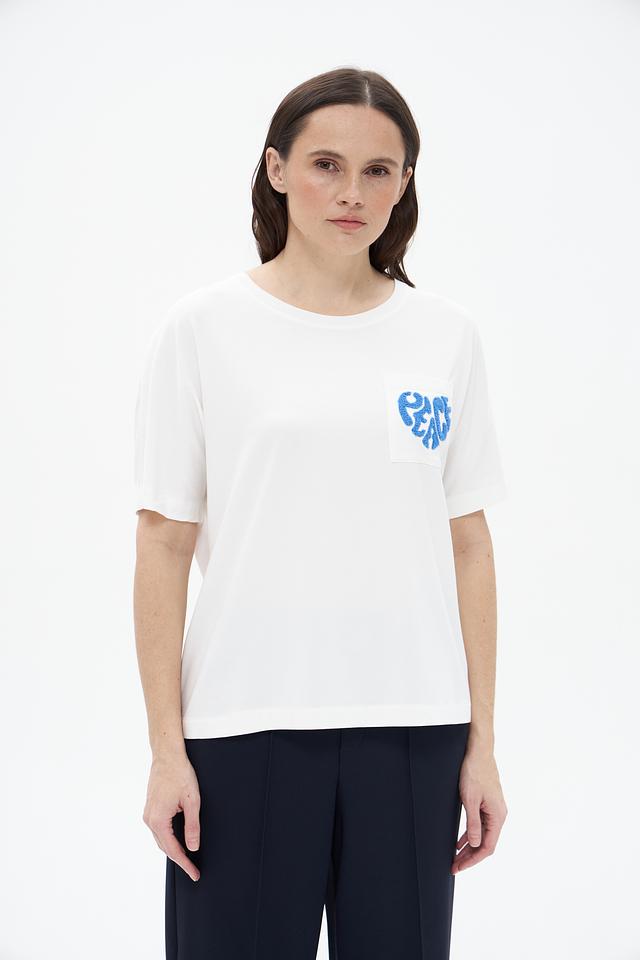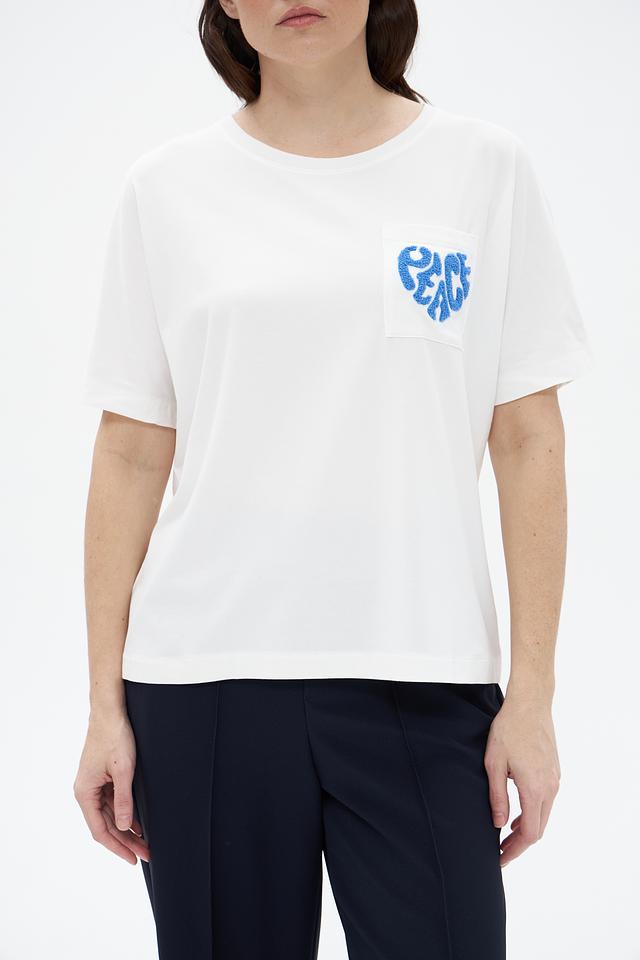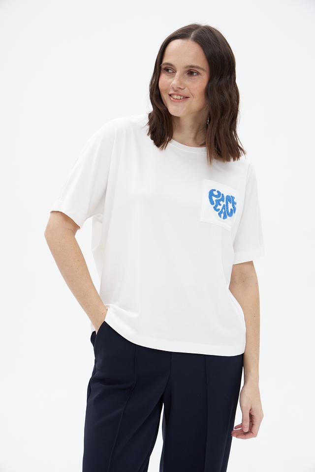 Белая футболка Oui с ярким принтом "PEACE" на нагрудном кармане. Изготовлена из мягкого хлопка с модалом и эластаном для комфорта и свободы движений. Состав: хлопок 47%, модал 47%, эластан 6%