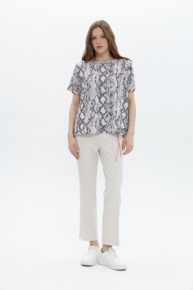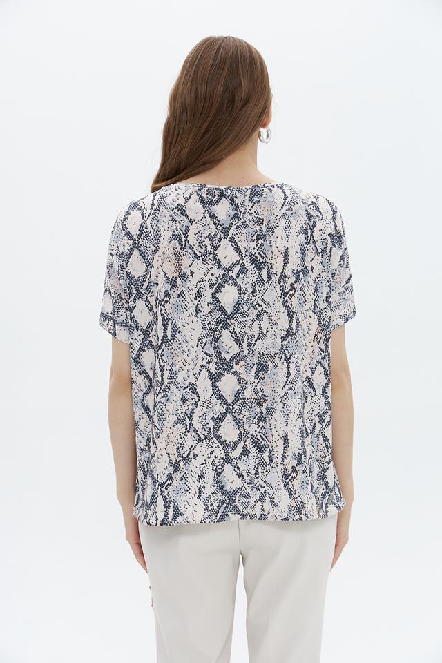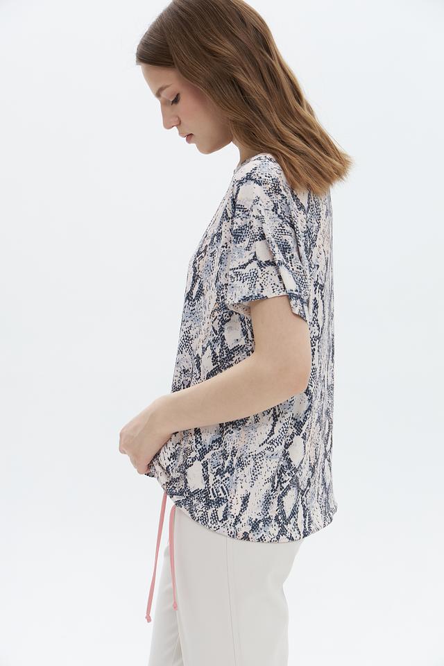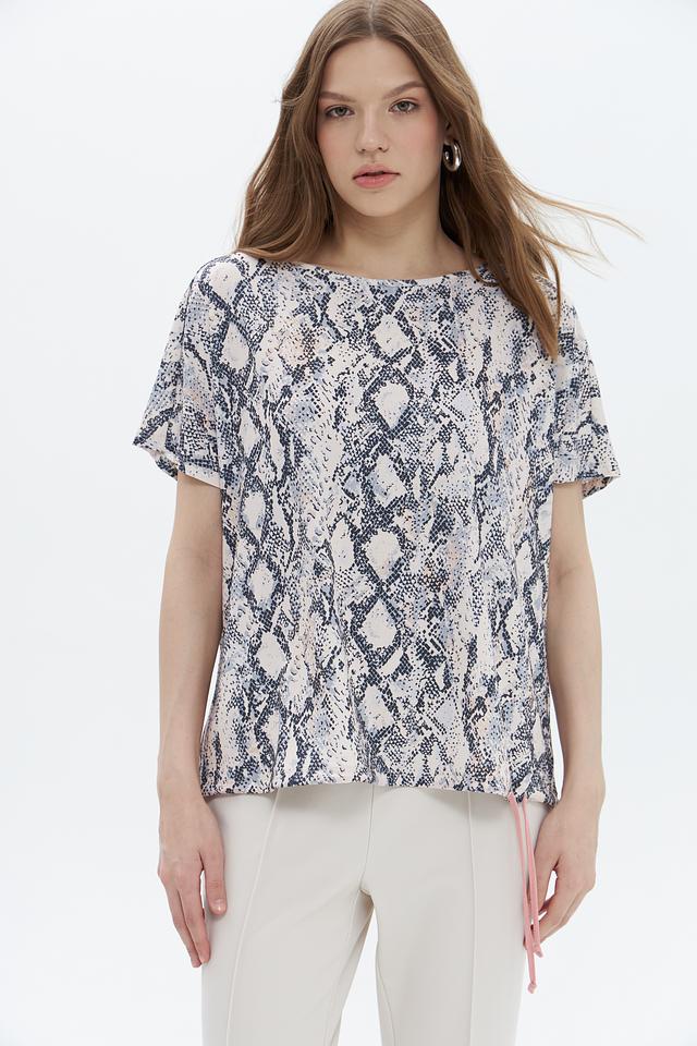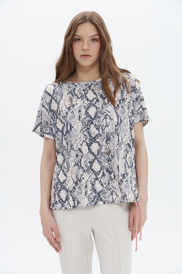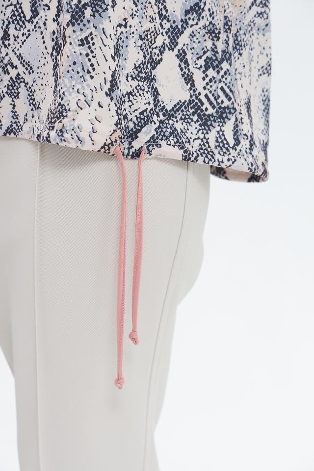 Особый акцент в этой модели – эффектный принт, имитирующий кожу рептилии, который добавит вашему образу оригинальности и стиля. Декоративные кисточки на подоле придают блузе изысканность и завершенность.