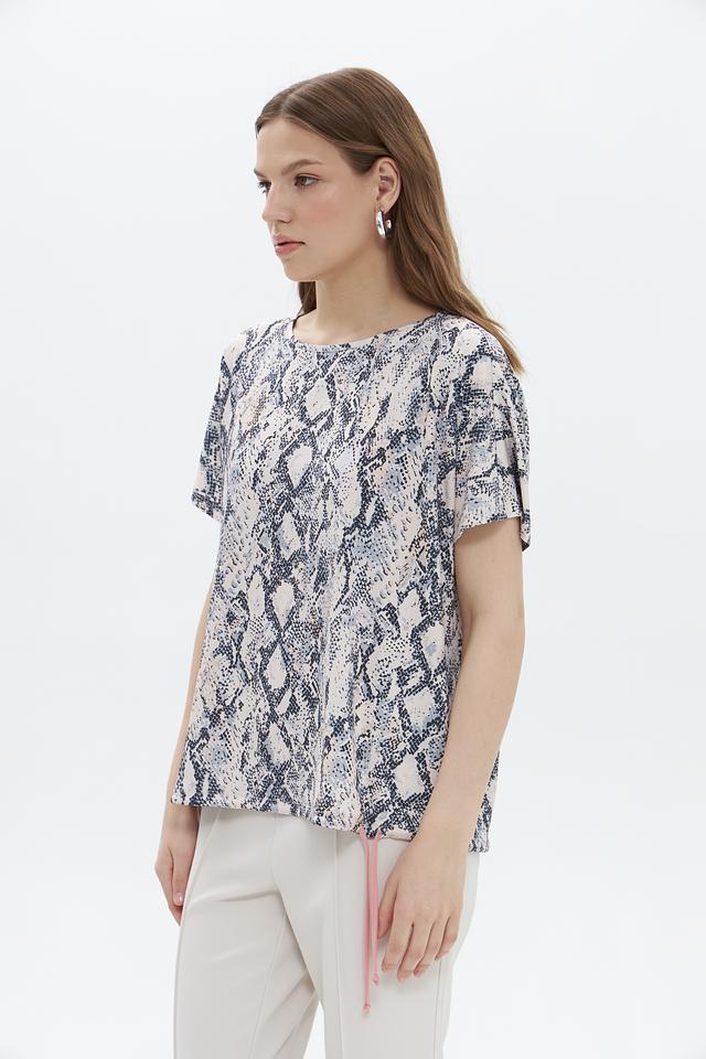 Блуза имеет свободный крой, который не сковывает движения, и округлый вырез горловины, который подчеркивает женственность. Короткие рукава делают ее идеальным выбором для теплой погоды.