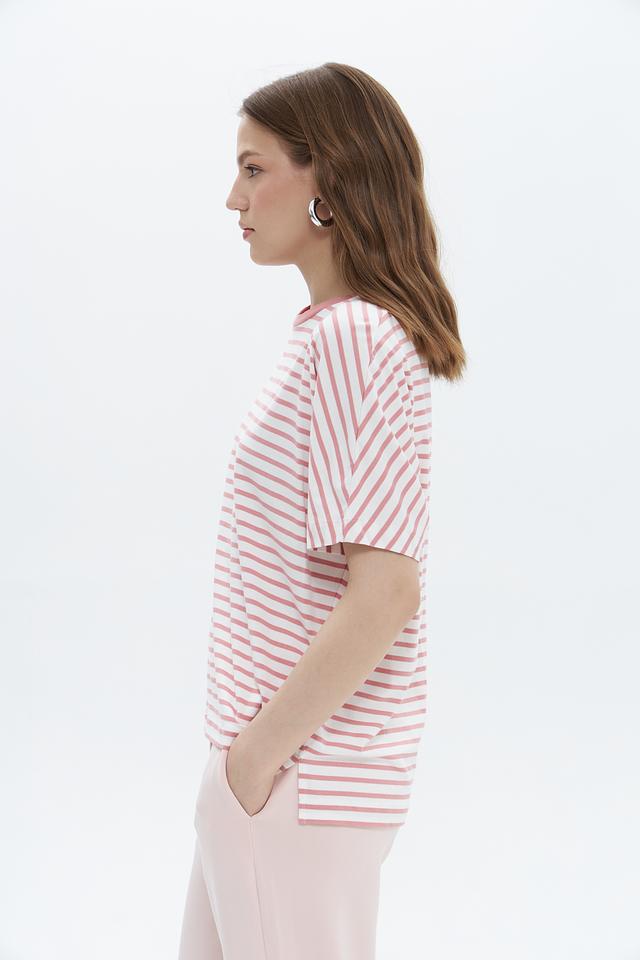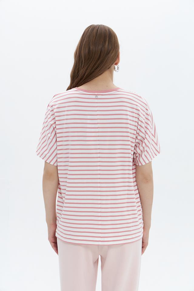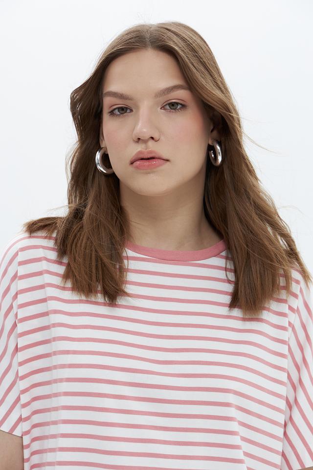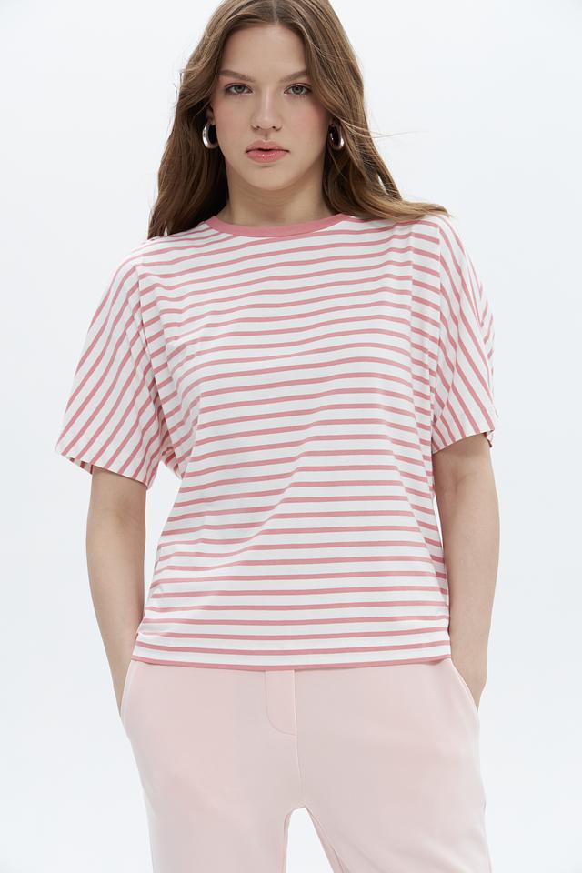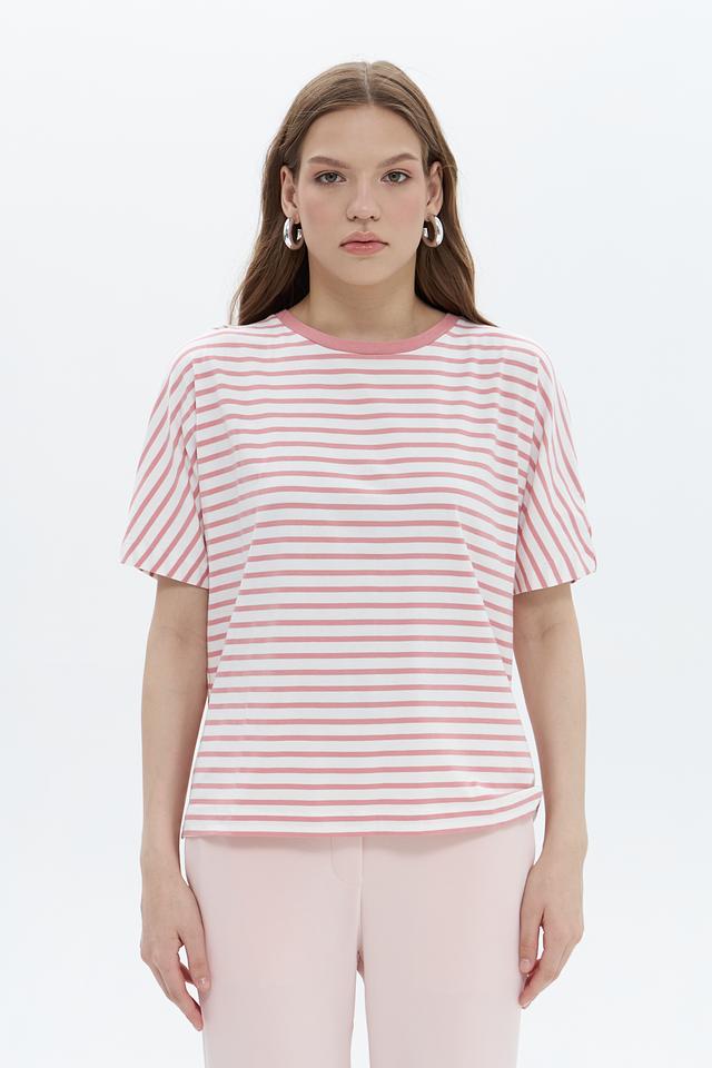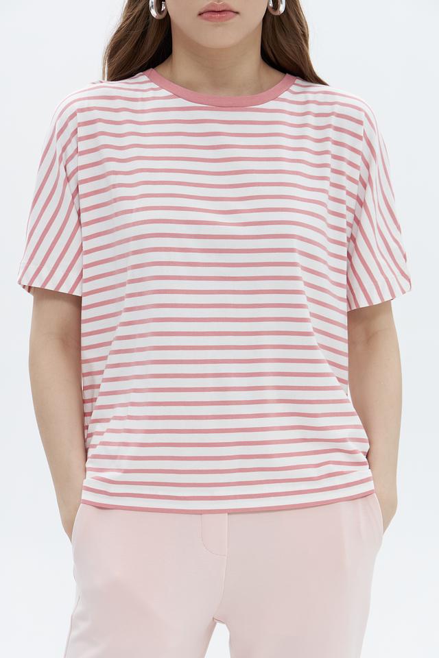 Женская футболка Oui нежно-розового цвета в полоску. Модель выполнена из мягкого хлопка с добавлением модала и эластана, обеспечивающих комфорт и хорошую посадку по фигуре. Состав: хлопок 47%, модал 47%, эластан 6%