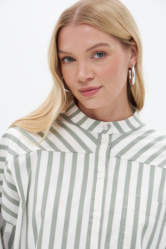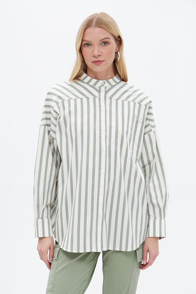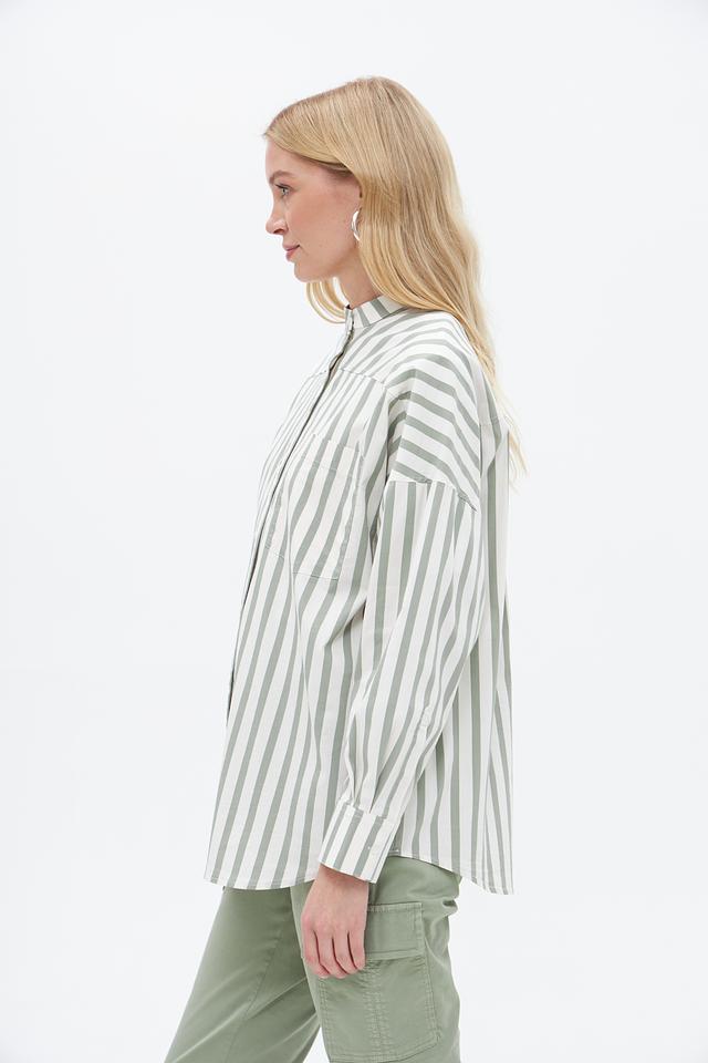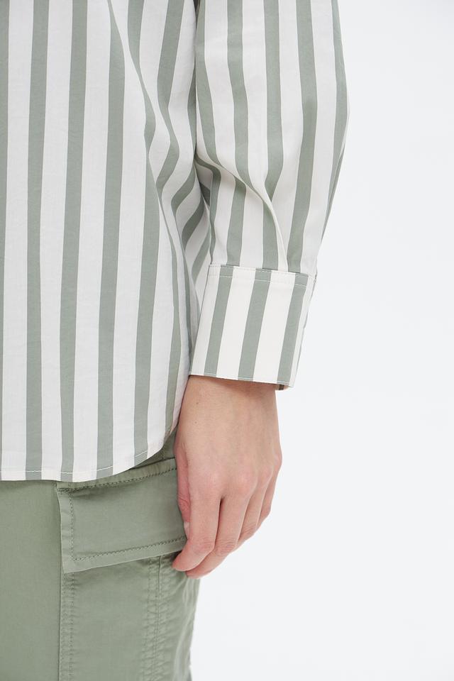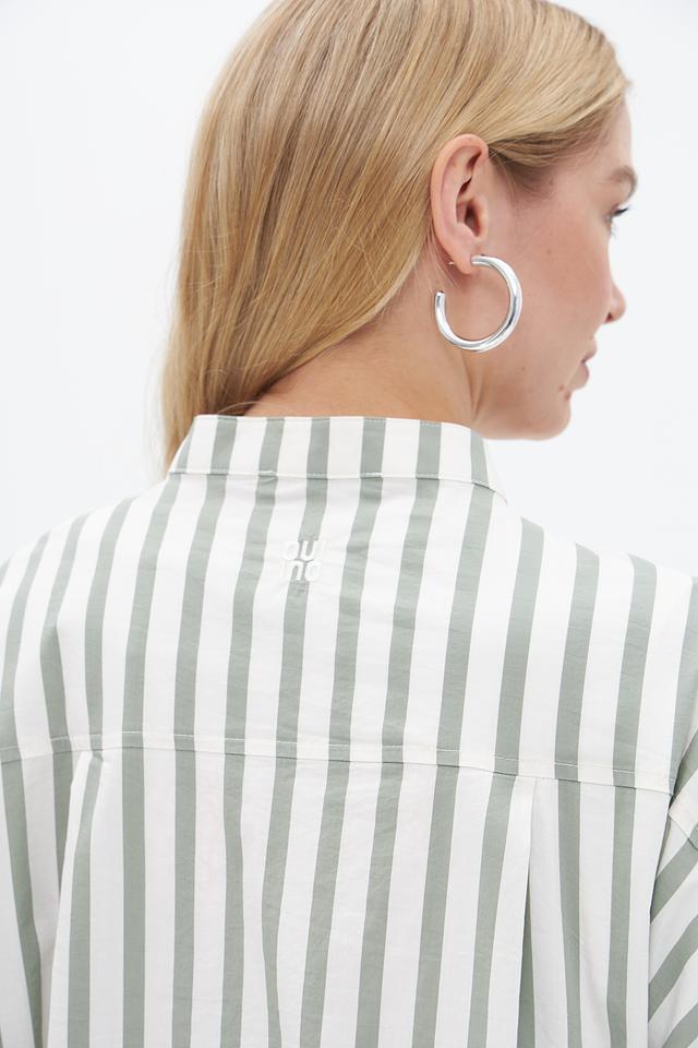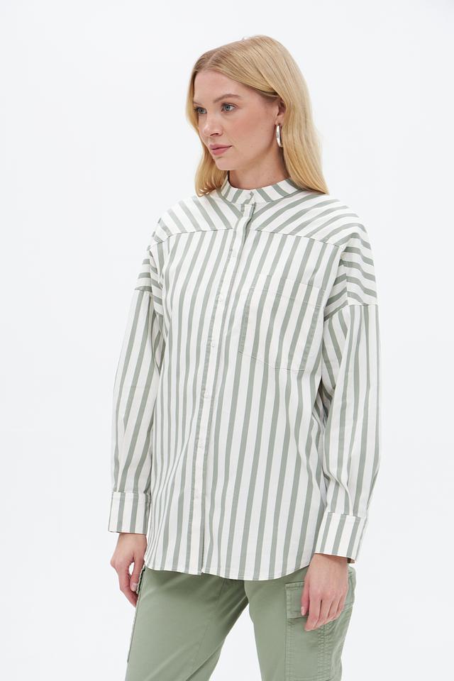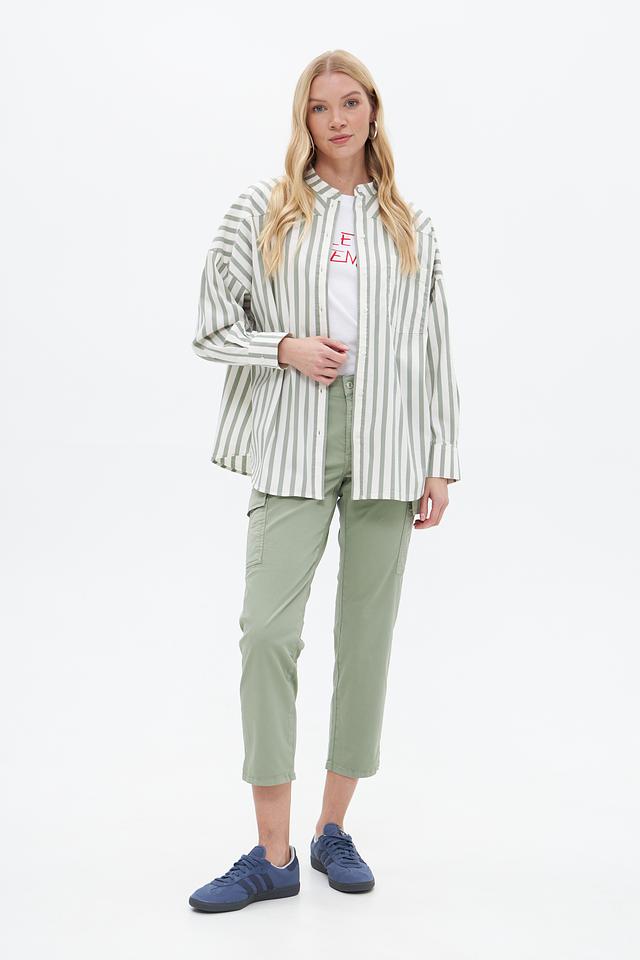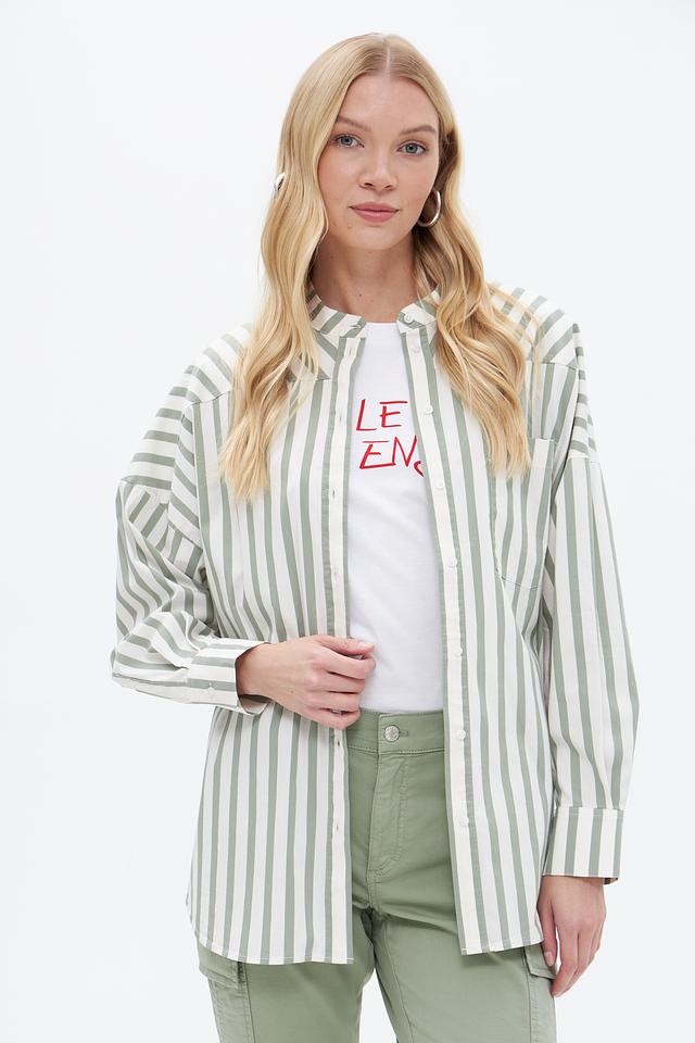Блузка от бренда Oui выполнена в вертикальную полоску, сочетающую оттенки зеленого и белого. Модель отличается свободным кроем, который обеспечивает комфорт в носке и позволяет создавать расслабленные образы.