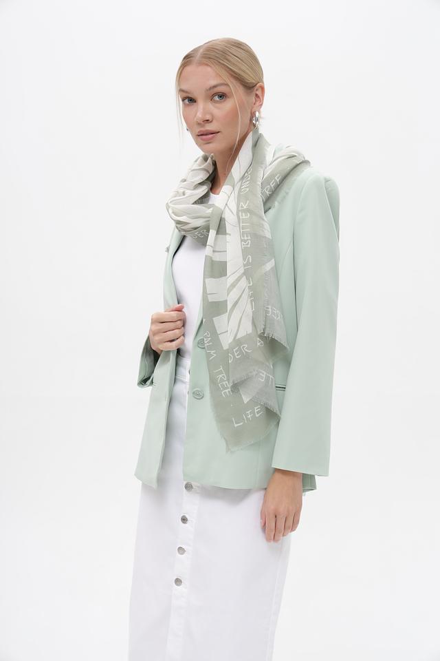 Изящный шарф от бренда Oui станет стильным дополнением к вашему образу. Шарф выполнен в нежном зелёном цвете и украшен оригинальным принтом, изображающим пальмовые листья и надписи.
