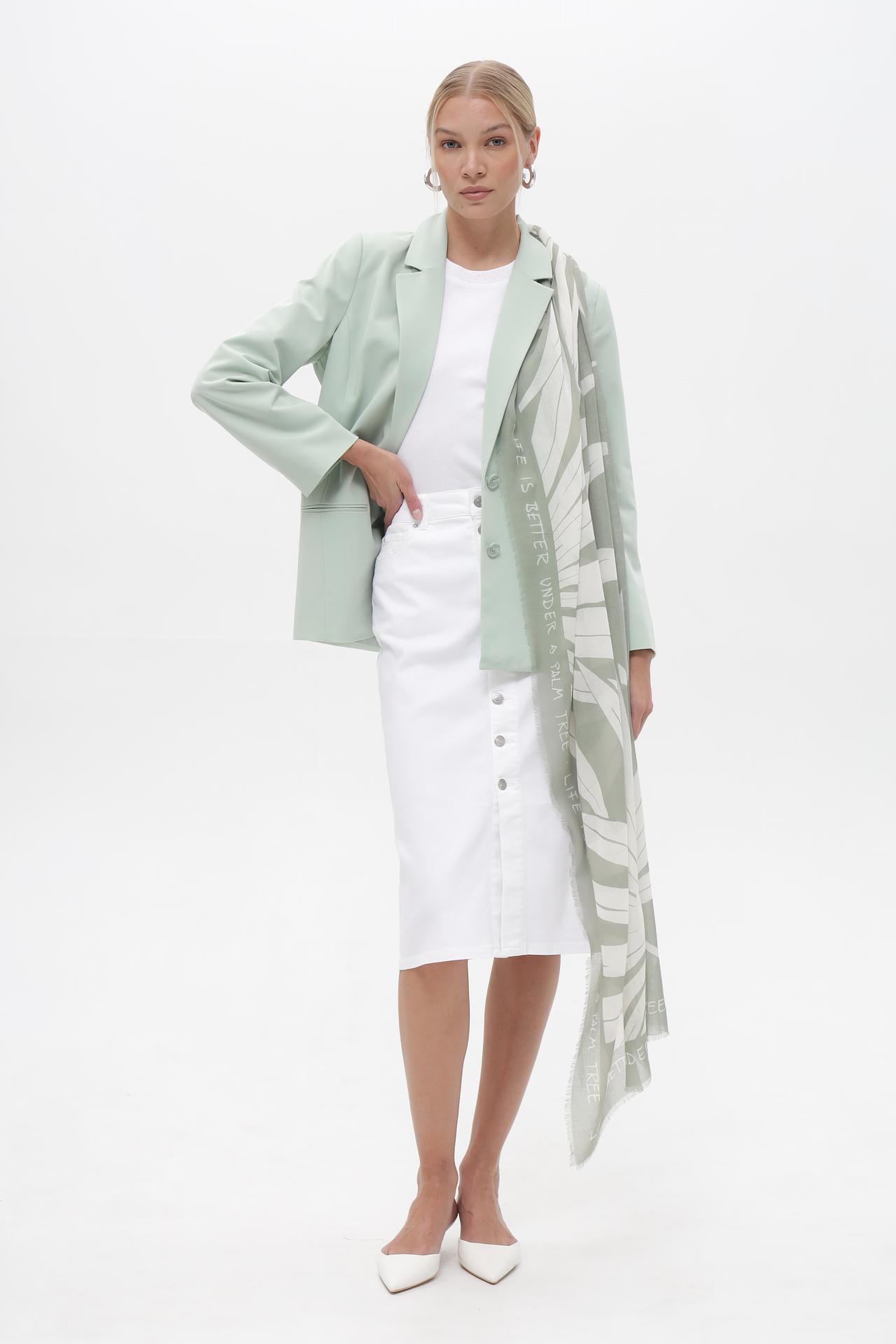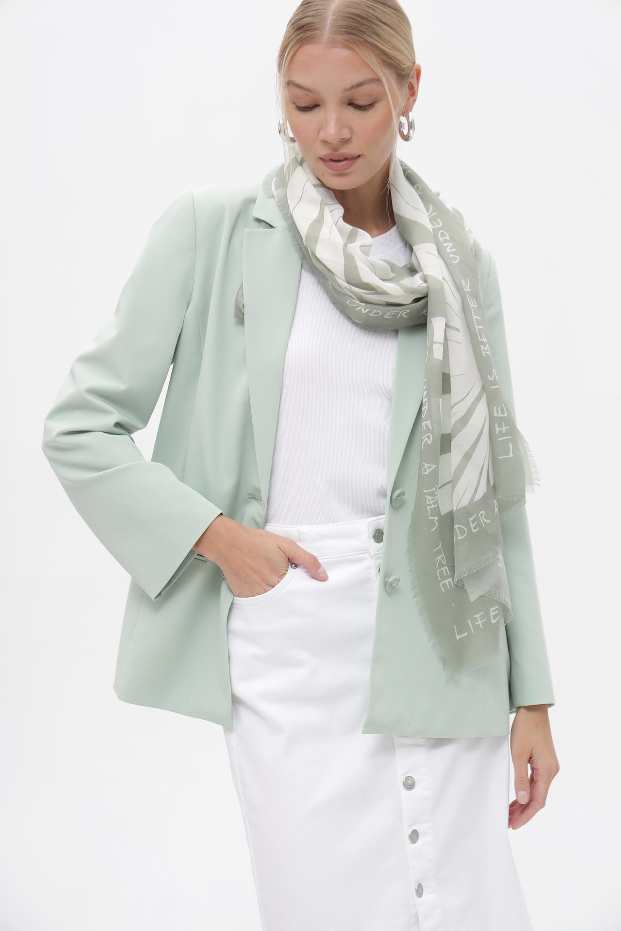 Легкий платок Oui из 100% полиэстера станет изысканным дополнением к вашему гардеробу. Этот стильный женский аксессуар сочетает в себе нежный зеленый оттенок и контрастный белый принт с геометрическим узором и вдохновляющей надписью "LIFE IS BETTER UNDER A PALM TREE". Платок идеально подходит для создания многослойных образов и придания завершенности повседневному или деловому стилю.